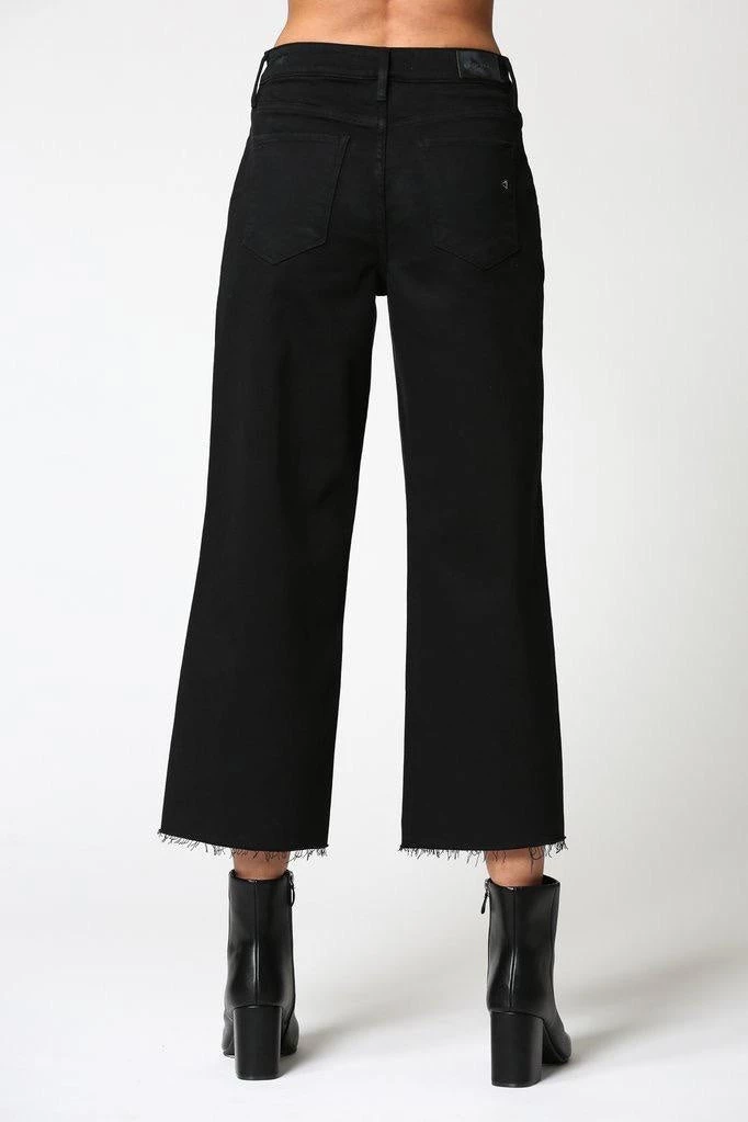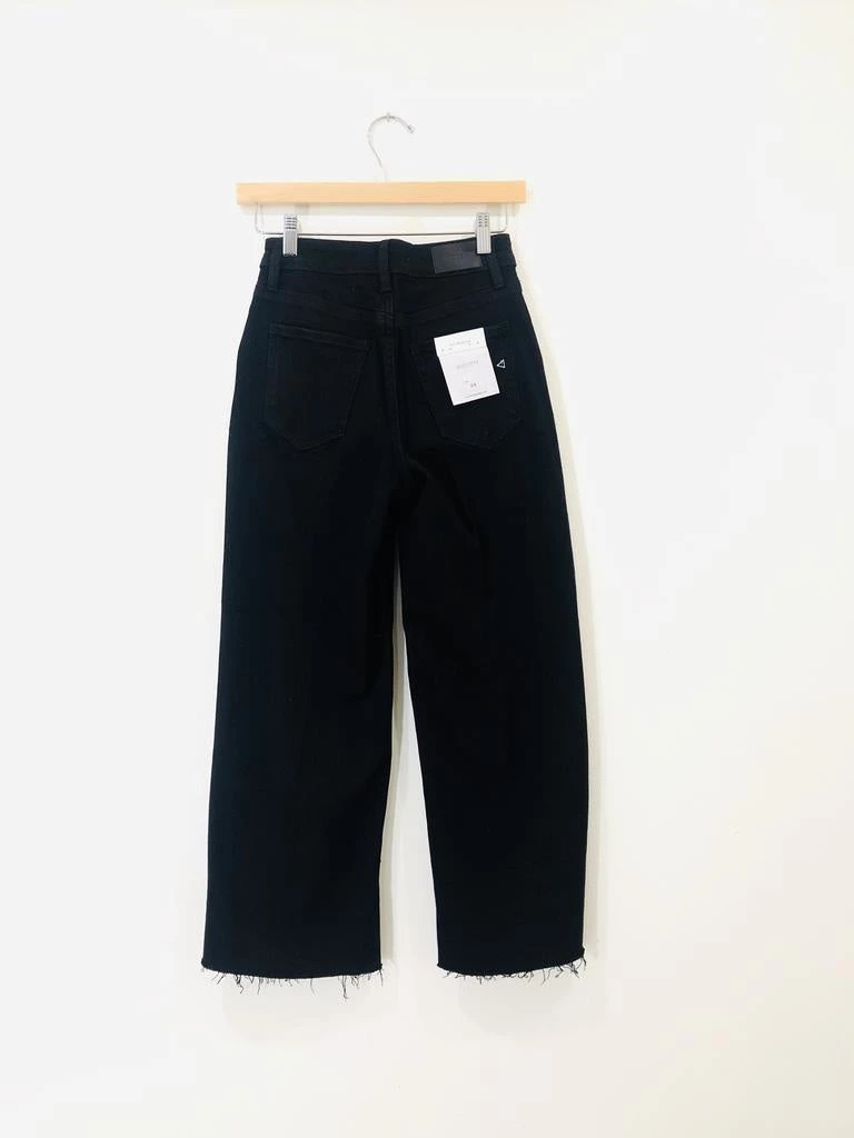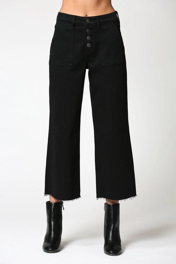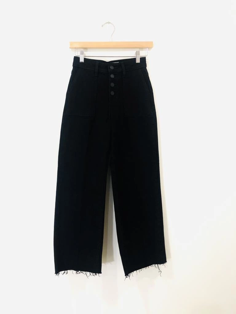 A black wash denim featuring utility pocket details and exposed button fly. These jeans are a high rise denim with cropped, raw hem wide-leg. Runs a bit big, so we recommend sizing down.