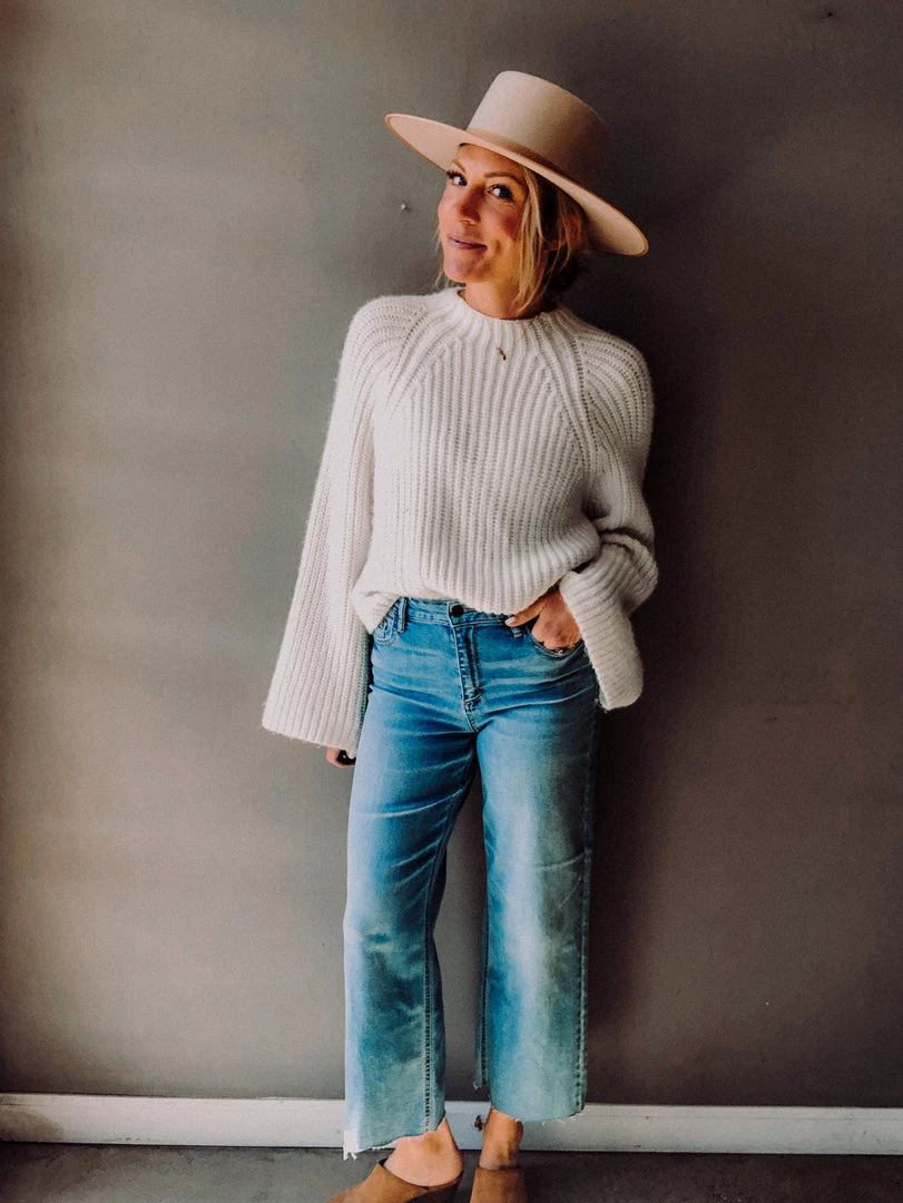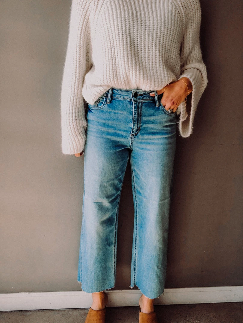 One of our best selling styles back in a basic denim. The Nori features a wide leg, raw hem, zipper front with button closure and a high rise fit. These jeans are so flattering on and can be dressed up or worn casual. Slightly oversized fit so we suggest sizing down.