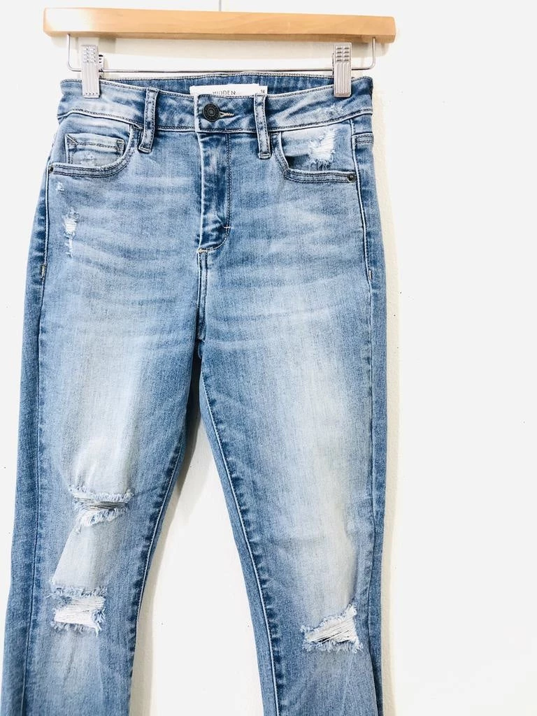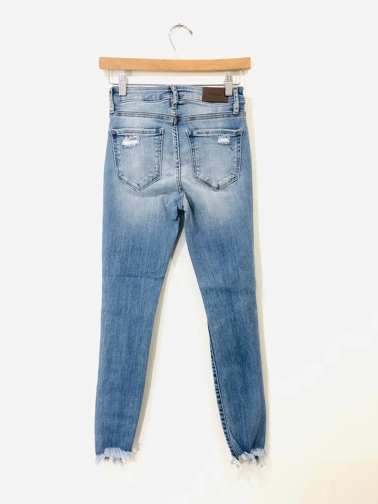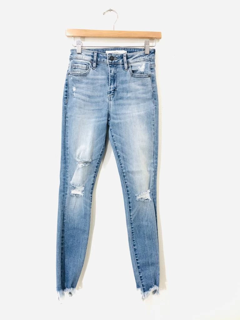 A light wash distressed high rise skinny with 93% cotton blend for that perfect denim fit. We love the distressed hem of this super comfortable, very flattering denim!! A great stretch that still holds everything in…hits right at the belly button.