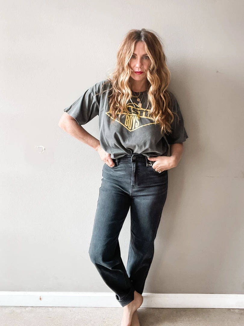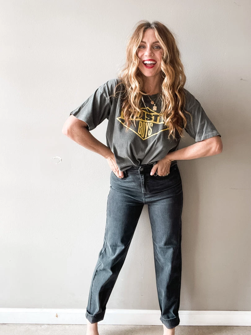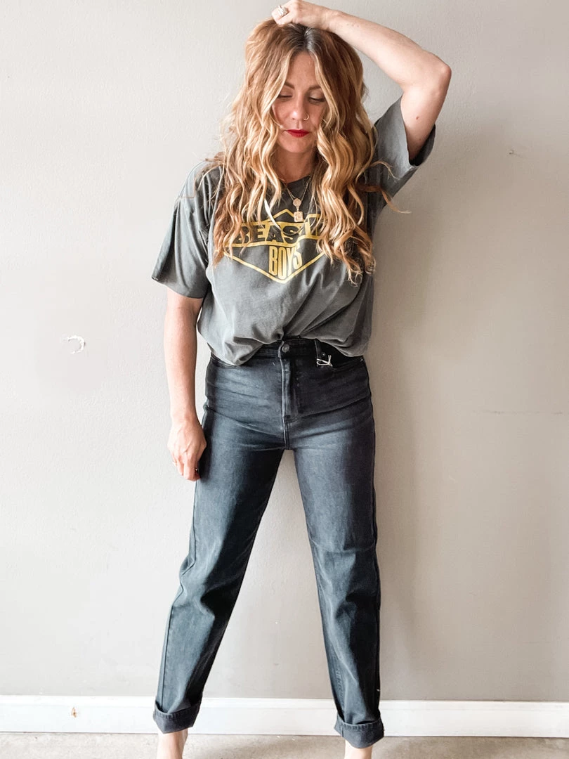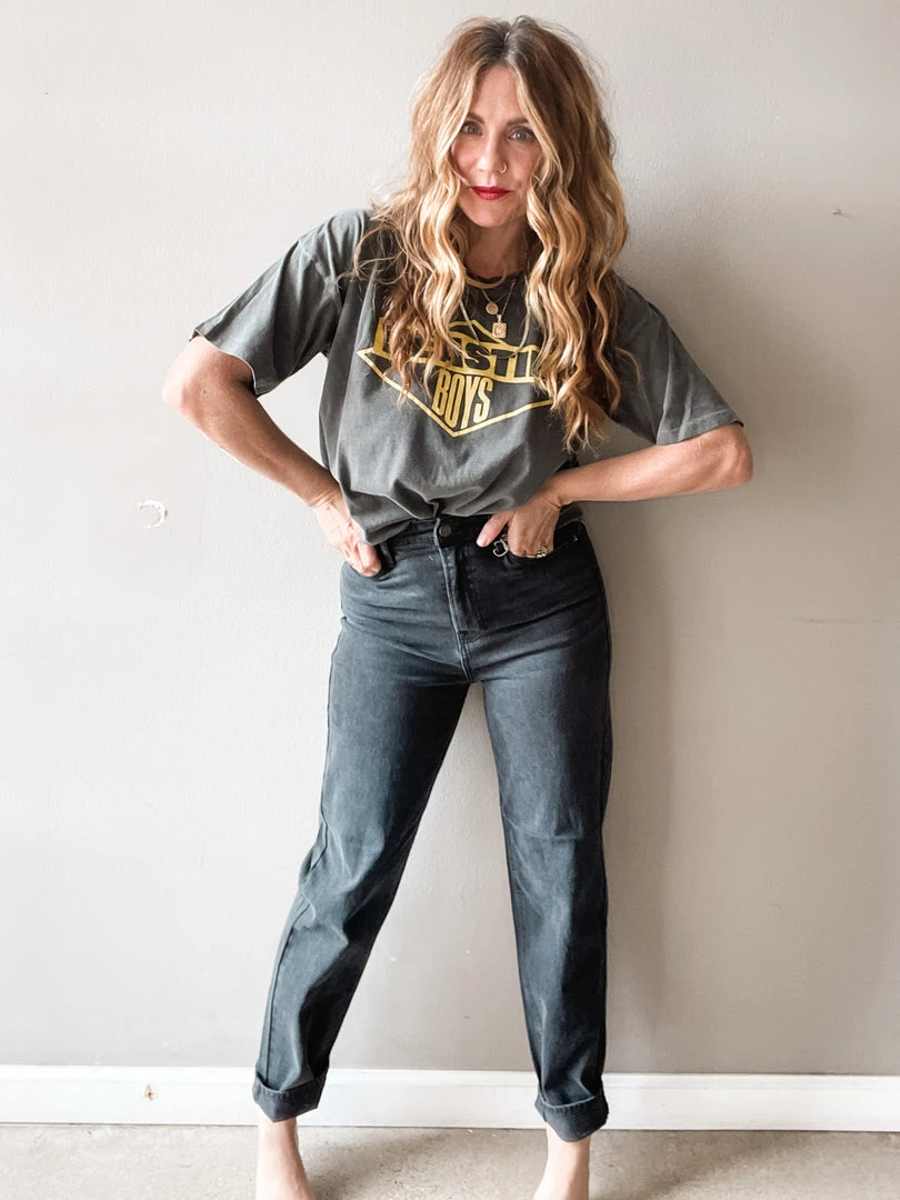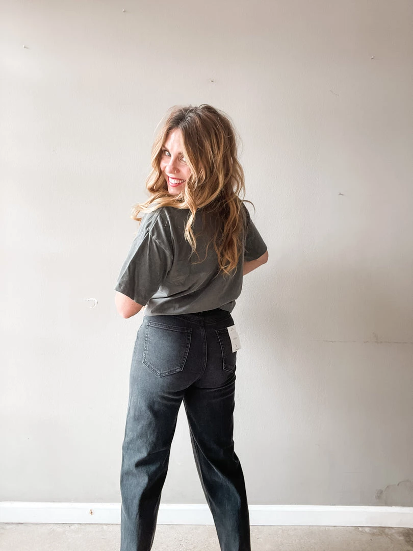 Our Hidden Zoey Mom Jean is a bestseller that we brought back in this chic and clean vintage black! We love these jeans because they actually have a bit of “give” and fit so well! A high waist with a fitted top and looser fit around the ankles, this easy denim can be worn as is, rolled up or tucked into boots!