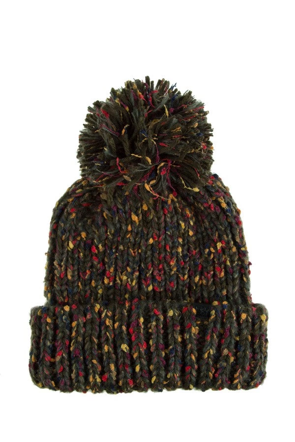 A ribbed olive chunky knit beanie with multi color flecks throughout and pom to cap it off.