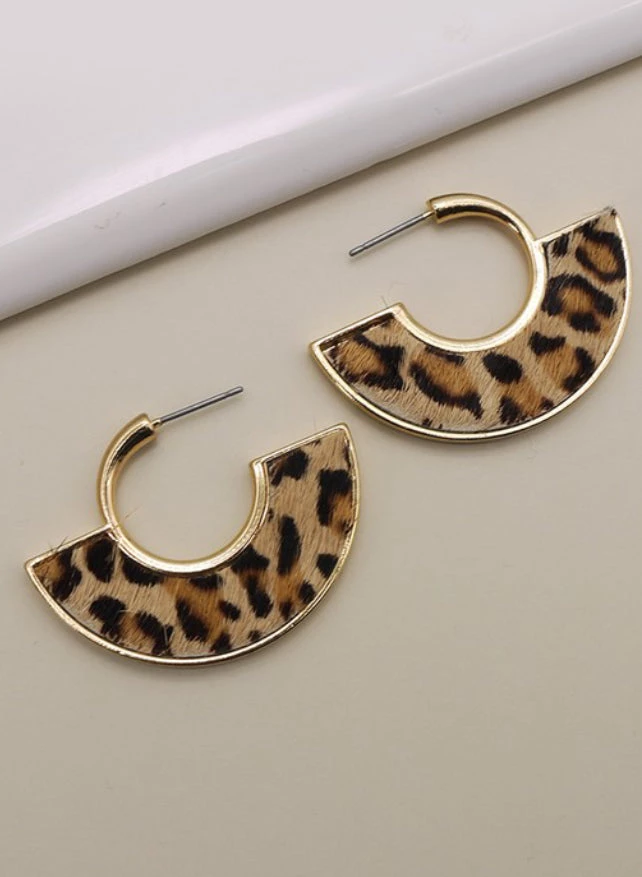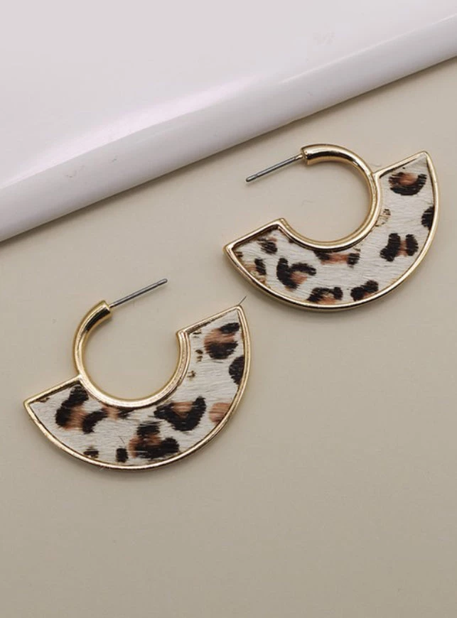 Available in a brown and white leopard, this crescent moon shaped open hoop with animal print accent is a fun pop to any outfit.