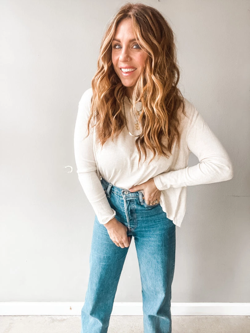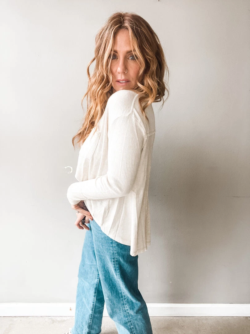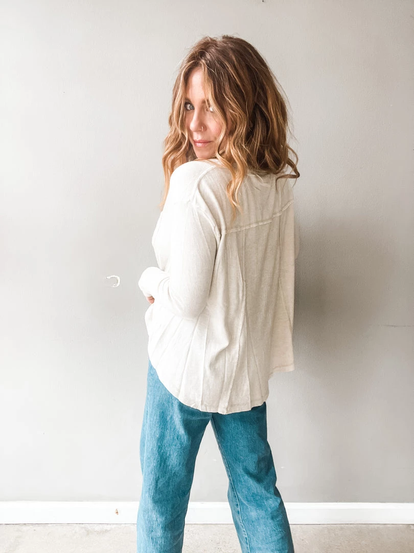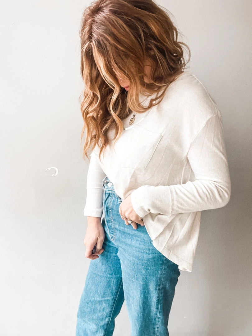 The Autumn Sky Long Sleeve is a chic and simple basic long sleeve with a cute little side pocket. We love the longer back silhouette of this must have oatmeal basic!