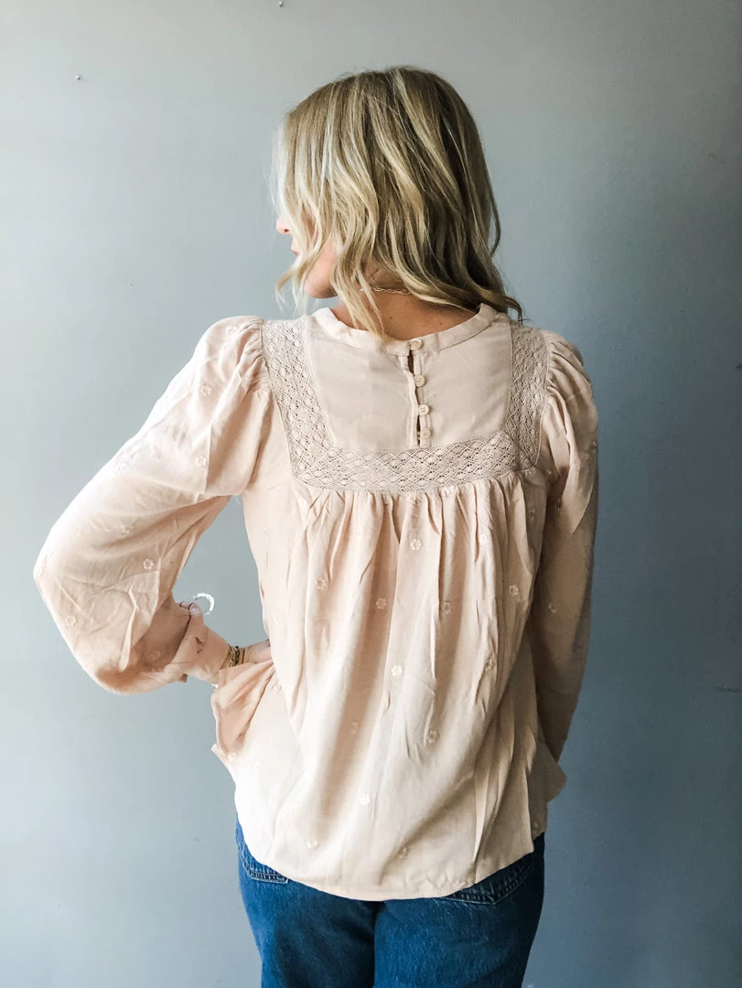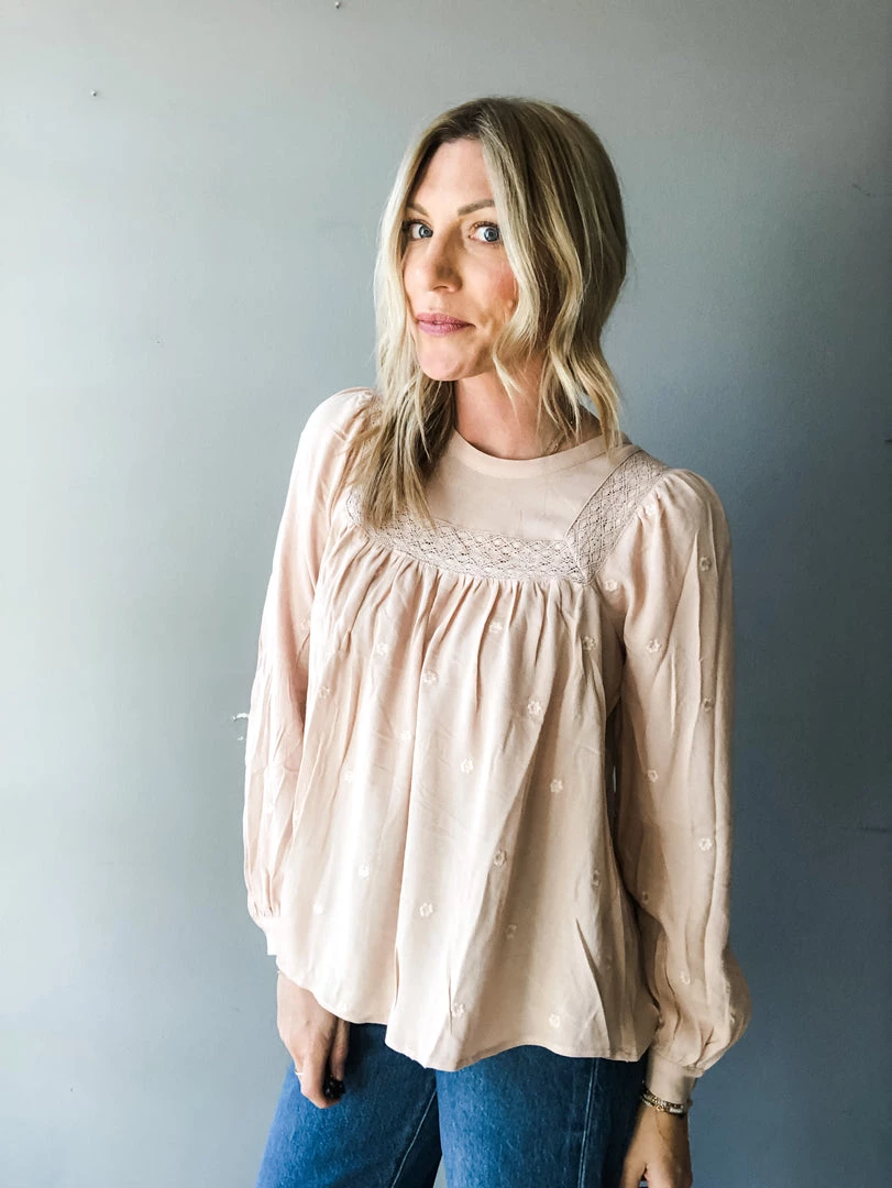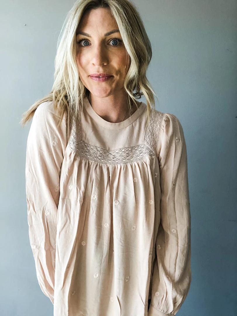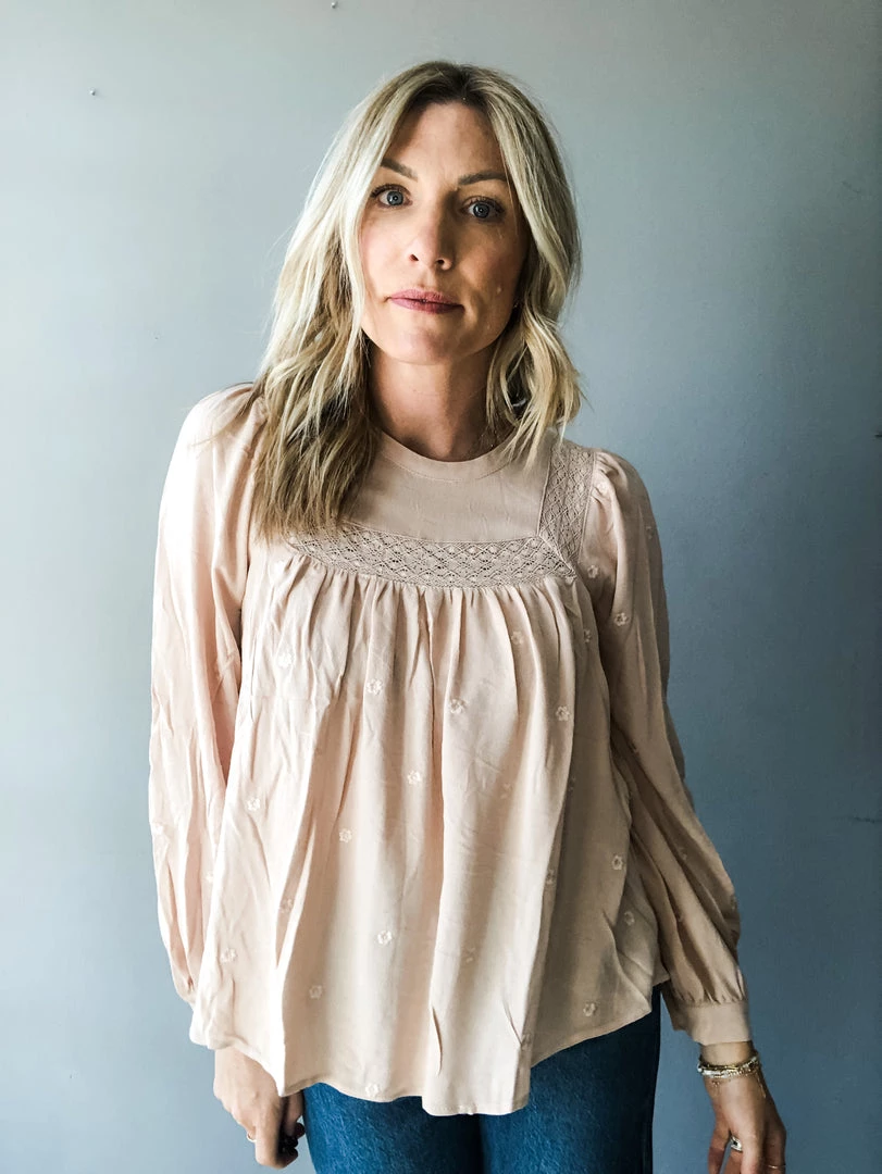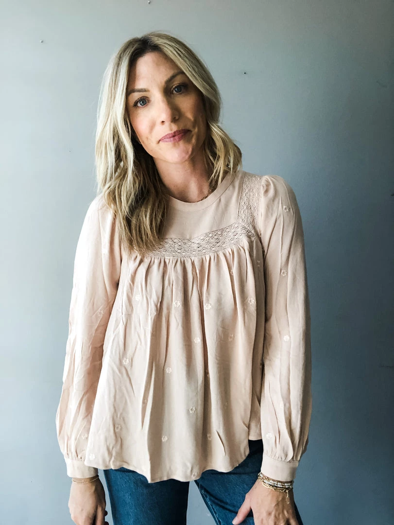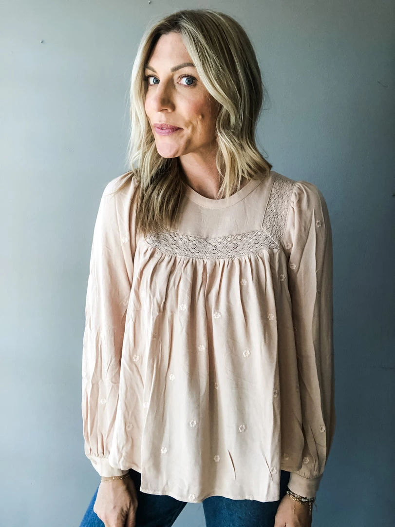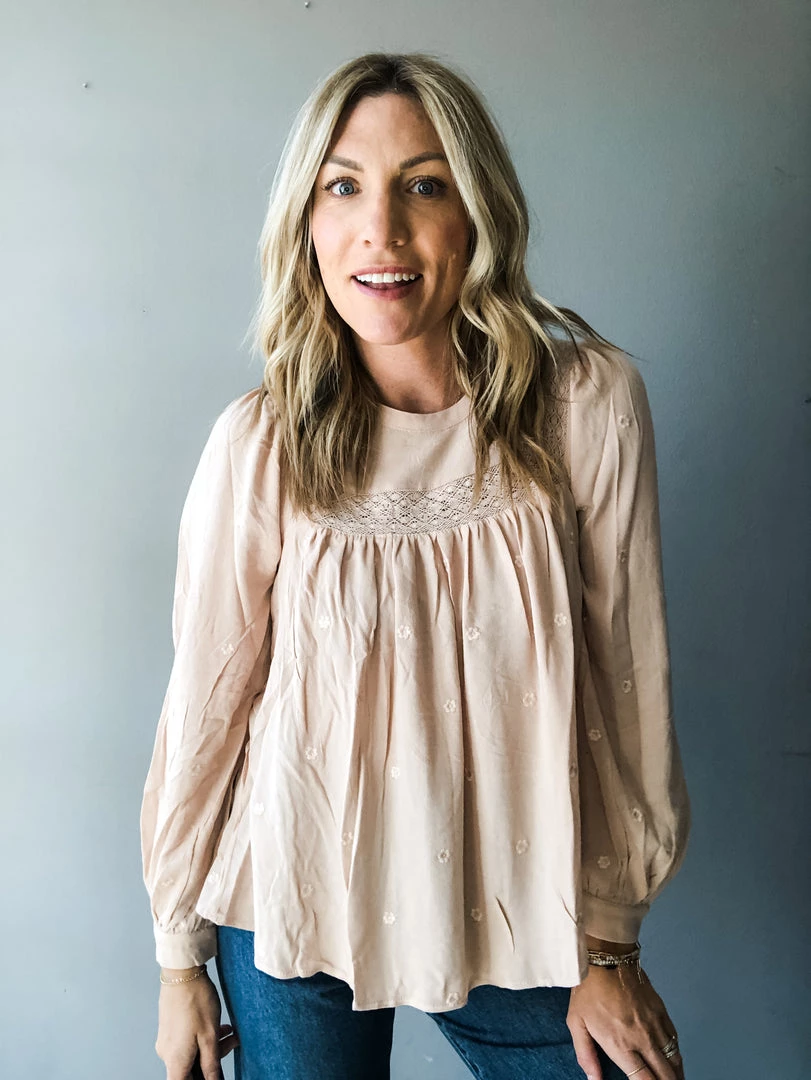 You can bet that this sweet blouse will be your go-to top for cocktails with the gals or your weekly Sunday family dinners. This light taupe top features an accented eyelet square neckline with button closures at the wrists and up the back of the neck. A blousy and flowy number with an empire-like fit that is so flattering on and makes for a sweet and breezy piece we love. With an allover stitched floral print you’ll find yourself reaching for this long sleeve again and again.