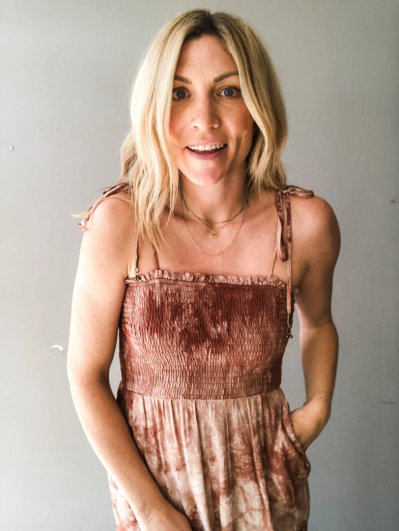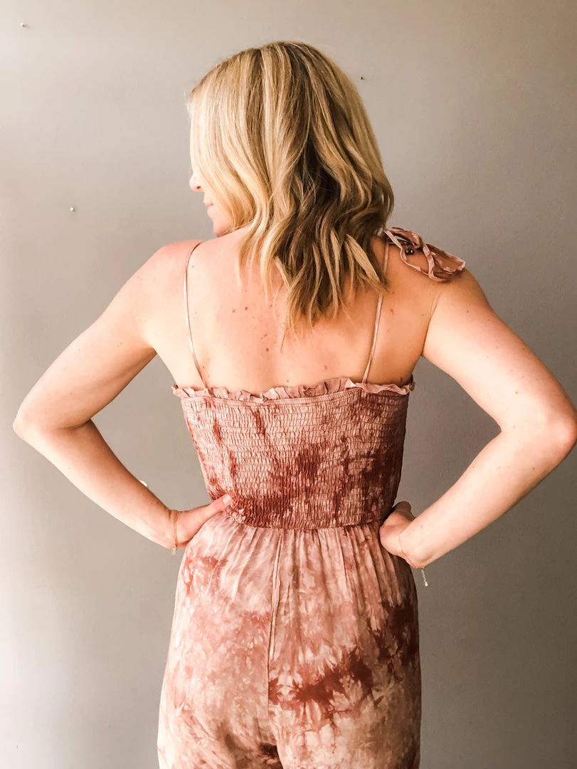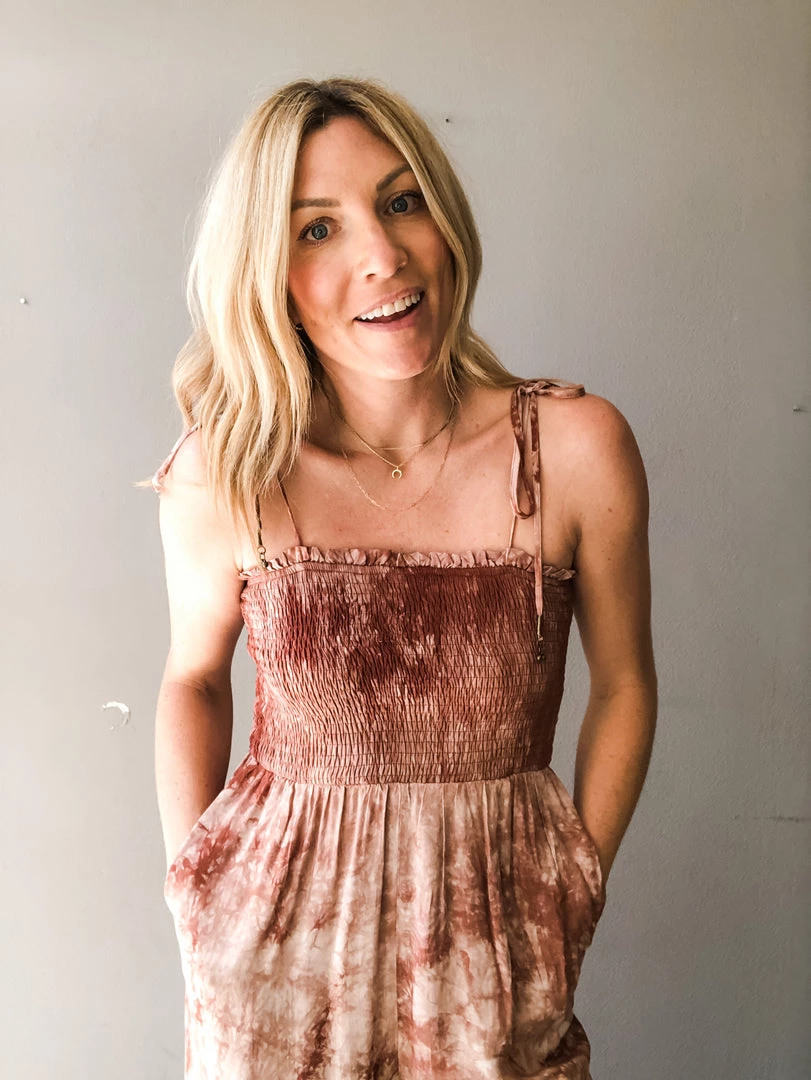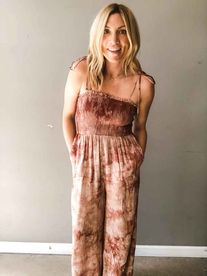 Taking the tie dye trend into spring with this cute jumpsuit. This full length pantsuit has a smocked upper with adjustable tie straps and loose fitting pants with side pockets. Dress up with wedges or toss on some flats and take her anywhere you heart desires. Perfect for a beach outting, farmer’s market run or date night. Comfortable and versatile.