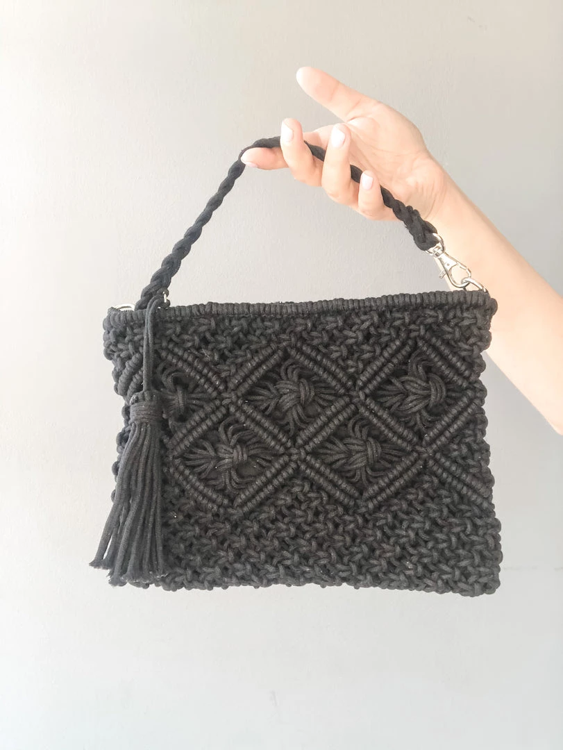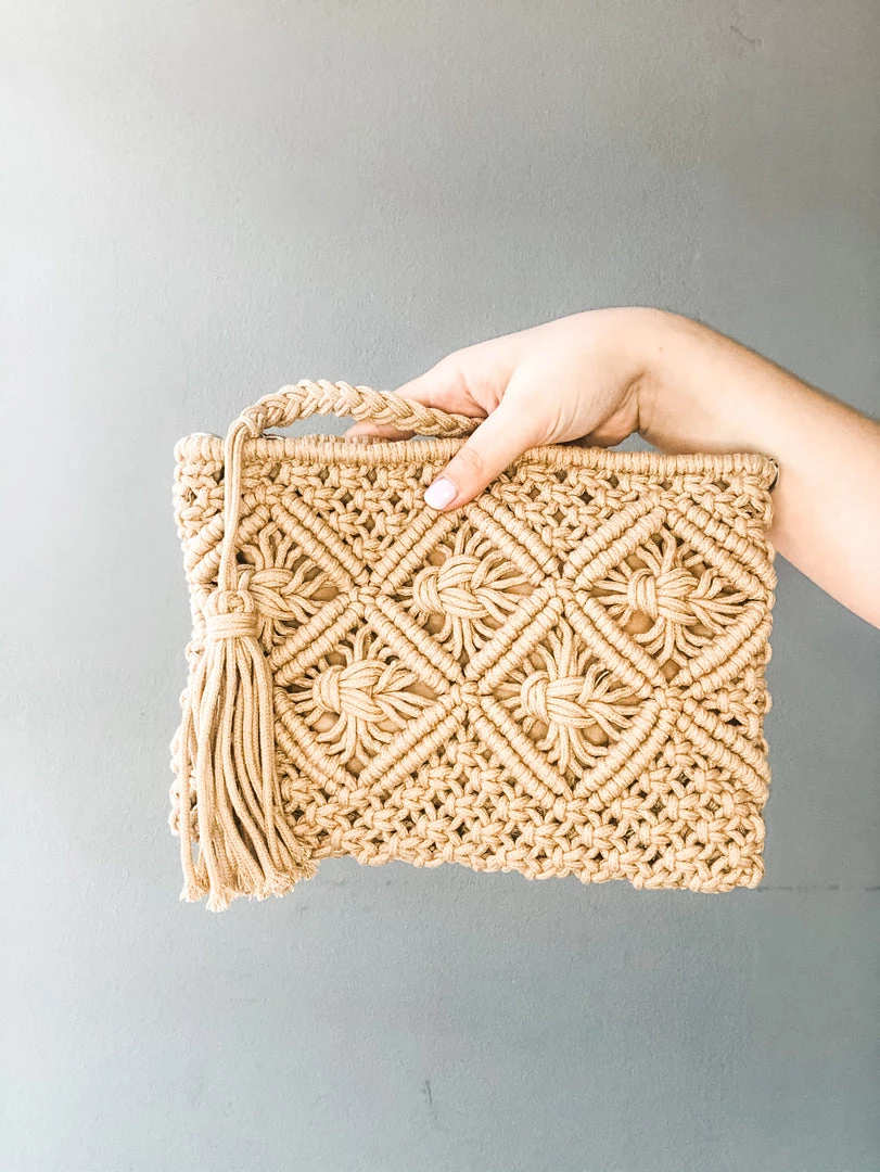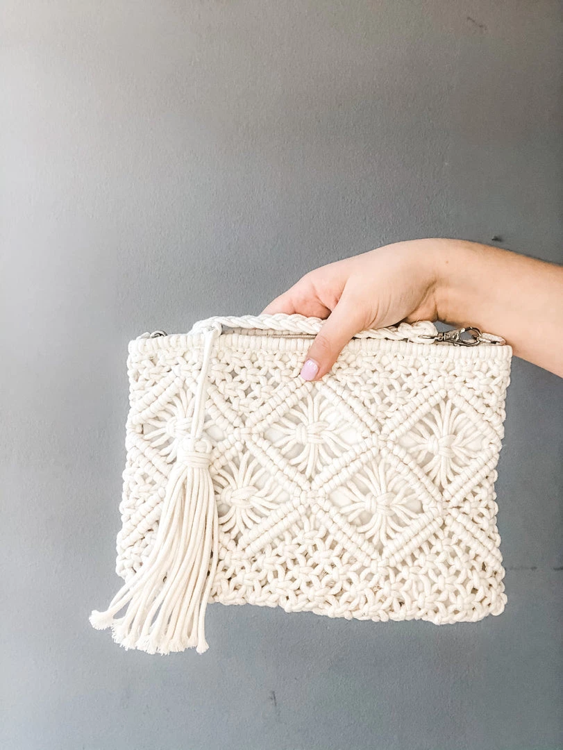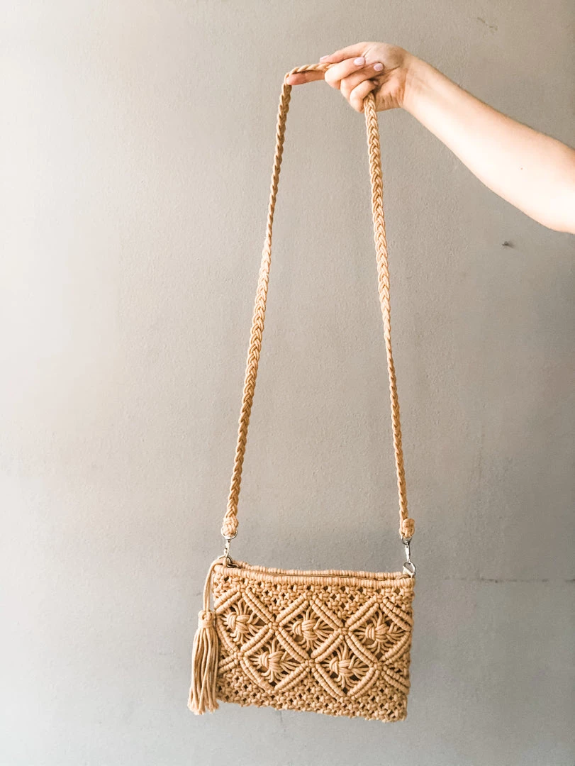 BEAUTIFUL HAND WOVEN MACRAME CROSSBODY WITH DETACHABLE STRAPS TO USE AS A CLUTCH. FEATURES MACRAME BRAIDED DESIGN, TASSEL ZIPPER END, AND A SOFT POUCH.