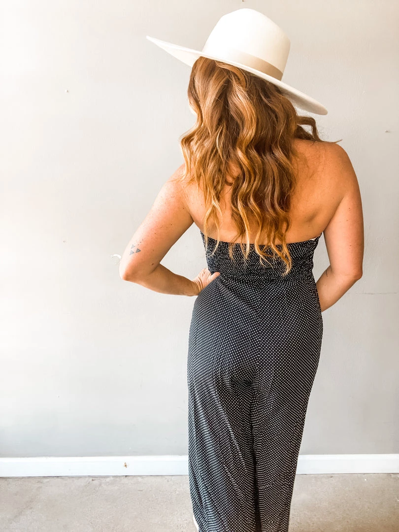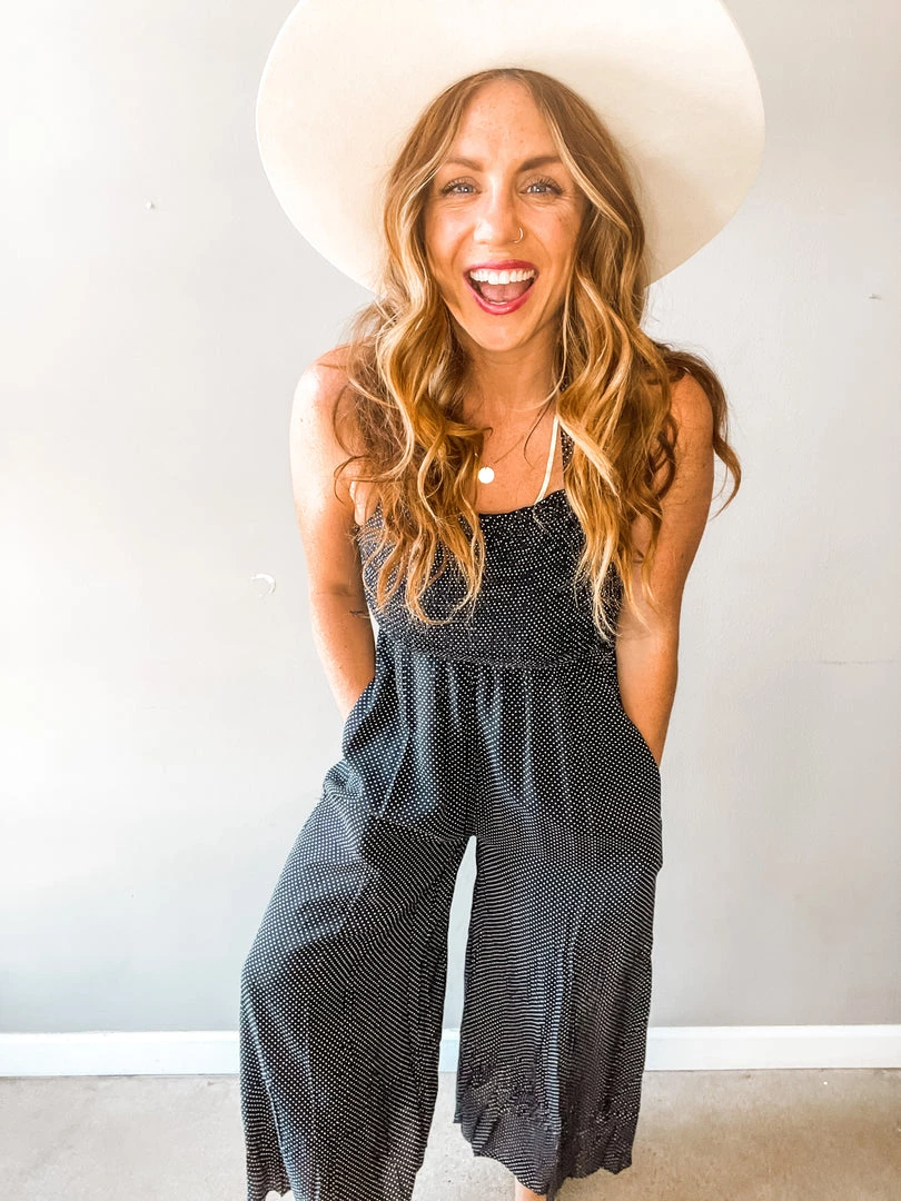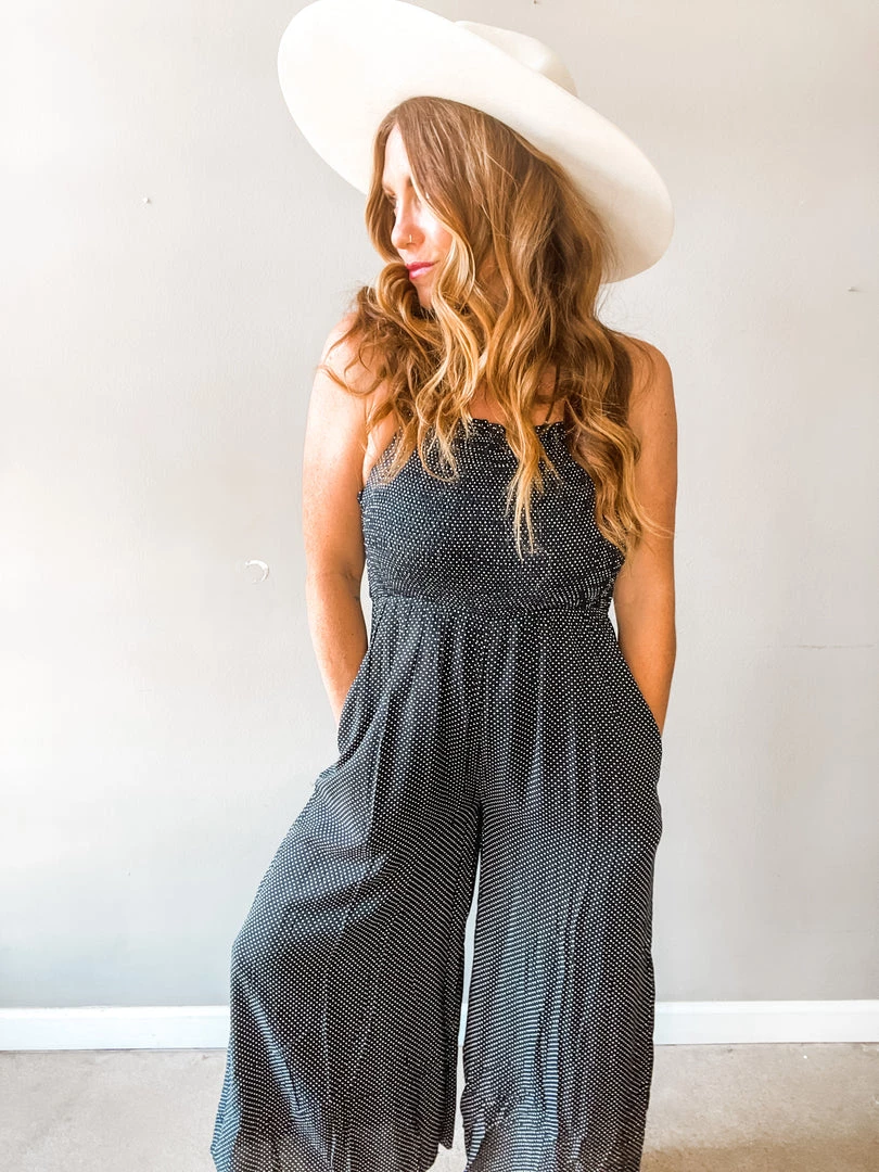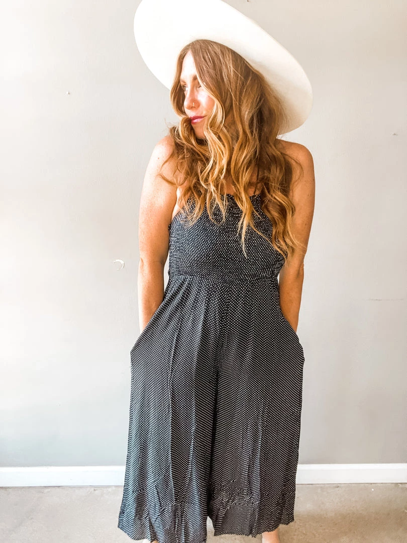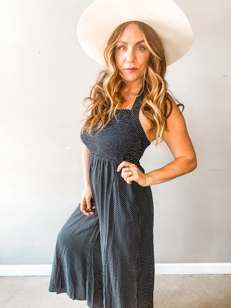 This comfy, flowy, smocked top halter style jumpsuit has a cropped hem perfect for easy spring and summer days! Perfect dressed up or down with sandals, boots, layered with jackets, and hats alike!