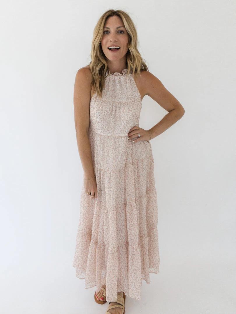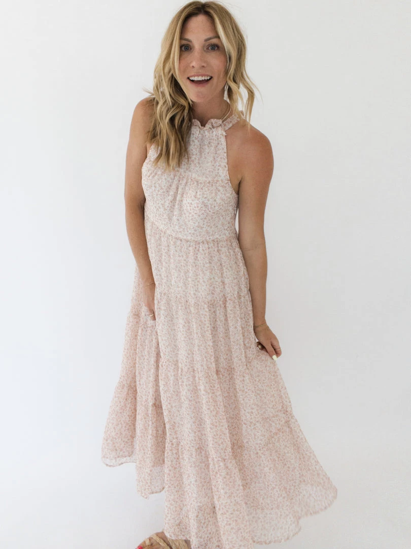 This soft feminine high neck dress with ruffle detail is perfect for brunching with the babes. Features a soft all over floral with flowy ruffle tiered skirt, adjustable tie at the neck, hidden side zipper and key hole detail at the neck. Lined.