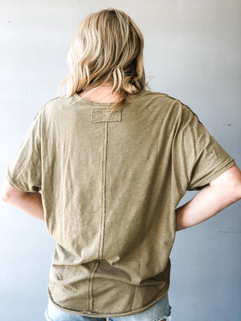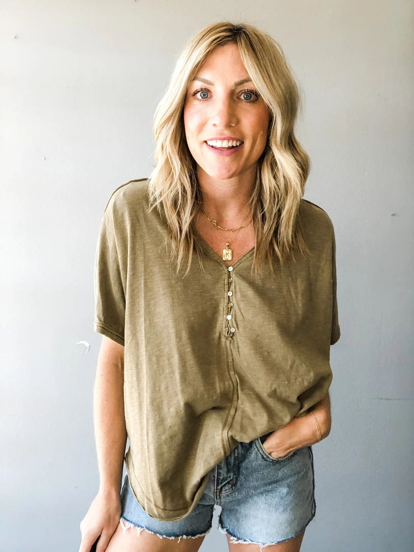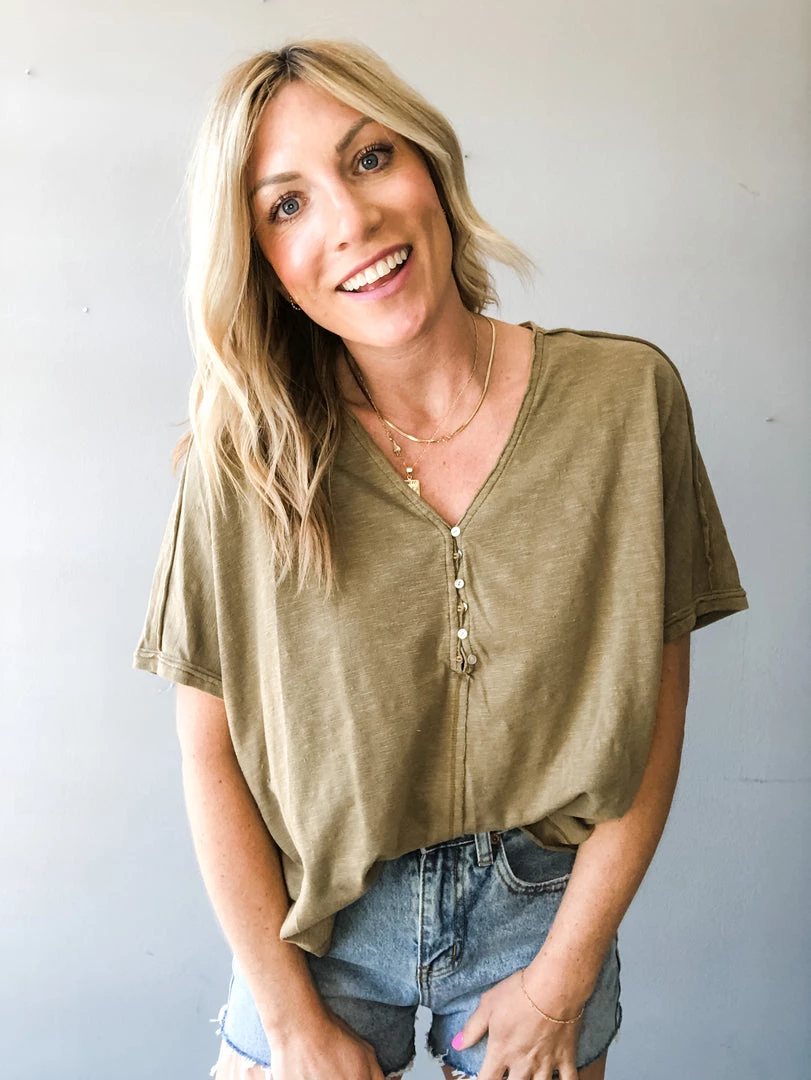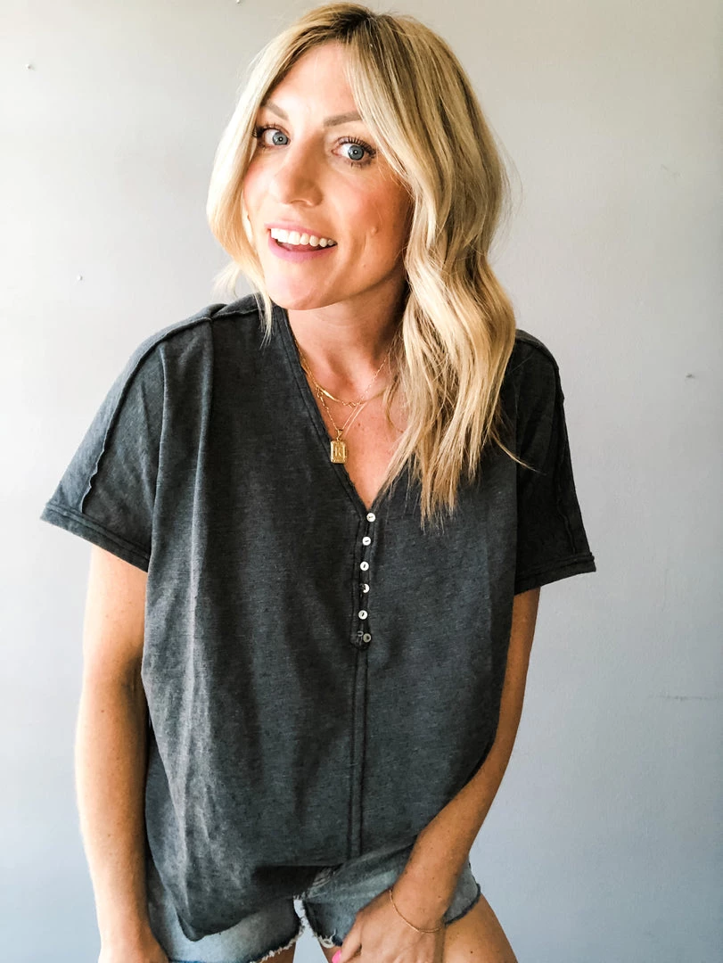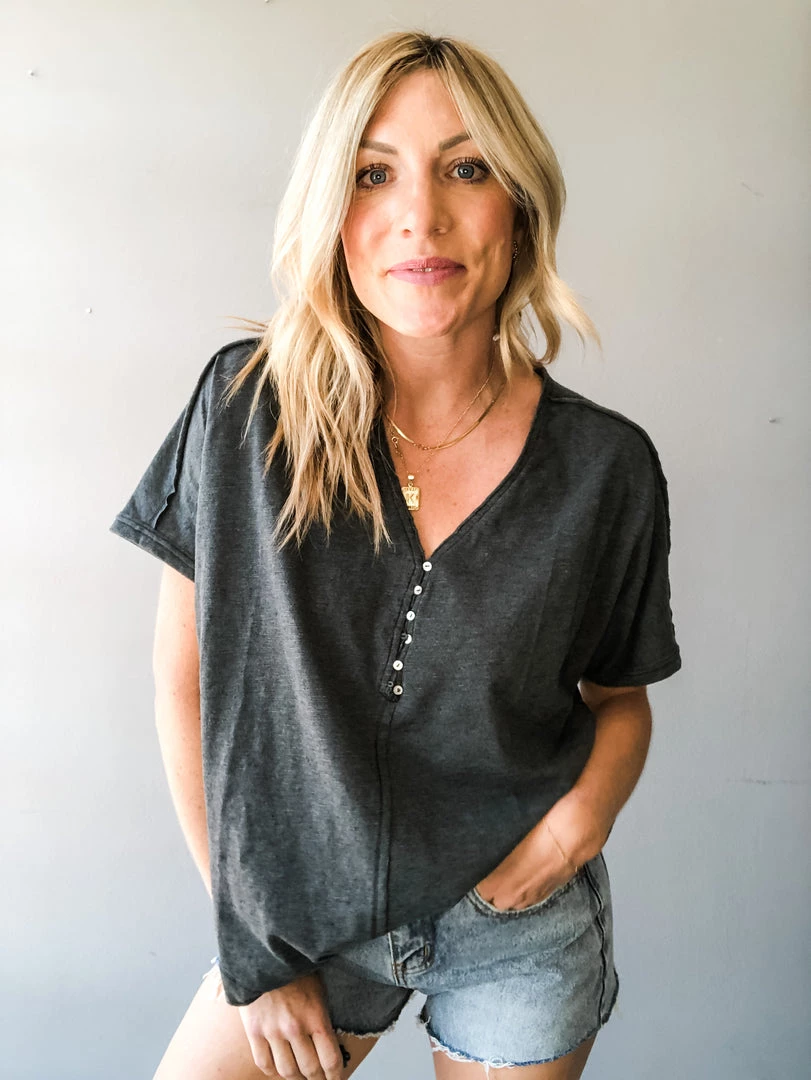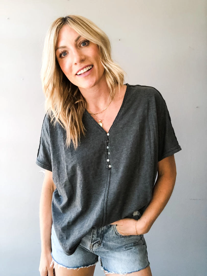 A loose fitting henley with raw edge and exposed seam details. Functioning button front with a vneck is the perfect tee to toss on with denim shorts or jeans any day of the week. An easy silhouette we can’t live without.