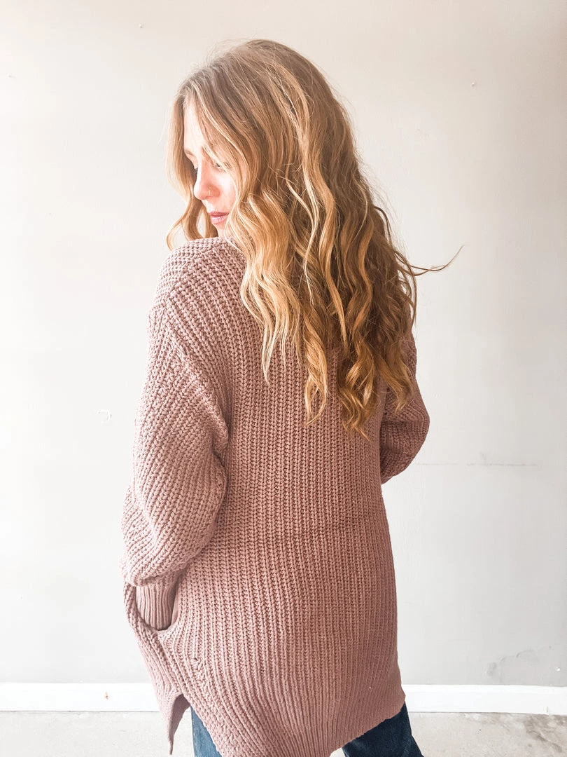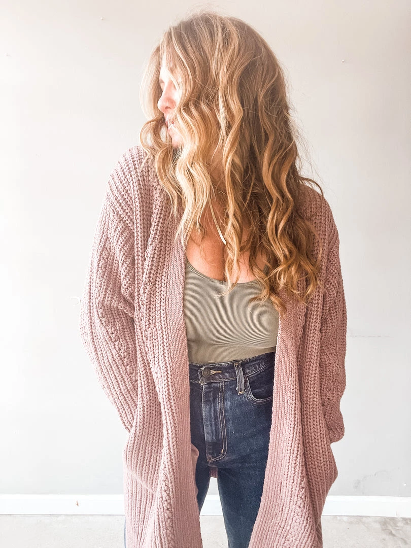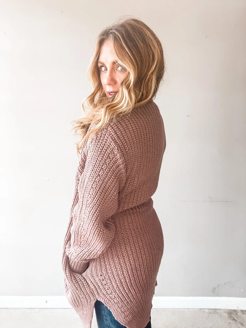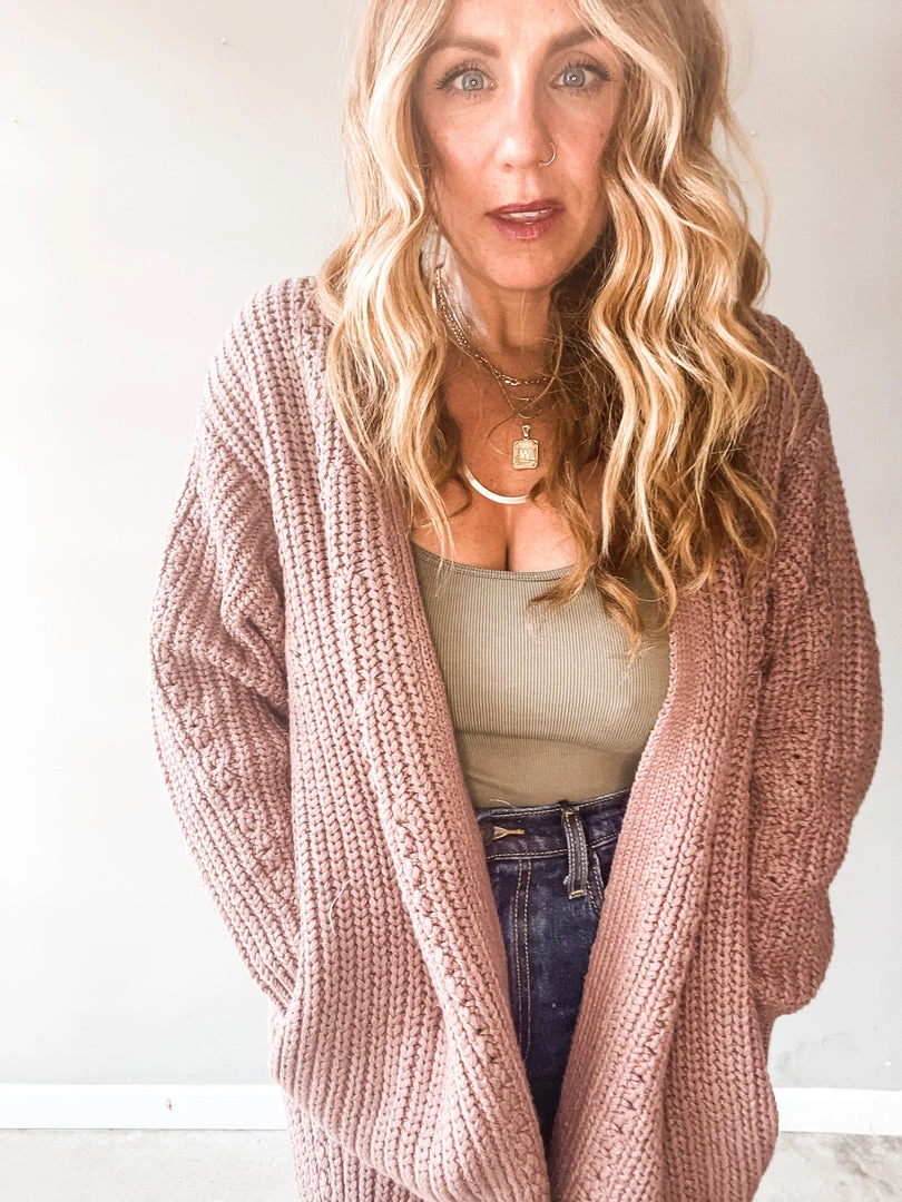 A cozy cardigan that feels like a dream on. A little weighted in the body for an ultra comfy fit that you’ll love to live in. This washed purple cardigan is a chunky knit with deep side pockets and cut hem. Love this paired with a basic tee and denim or tossed over a slip dress with some booties or sneaks.