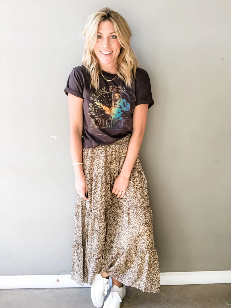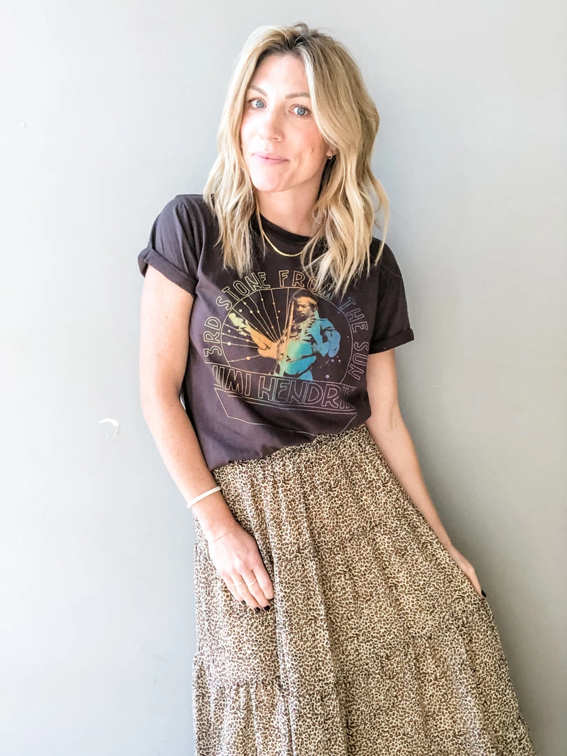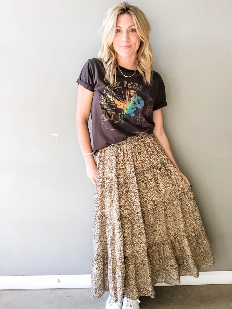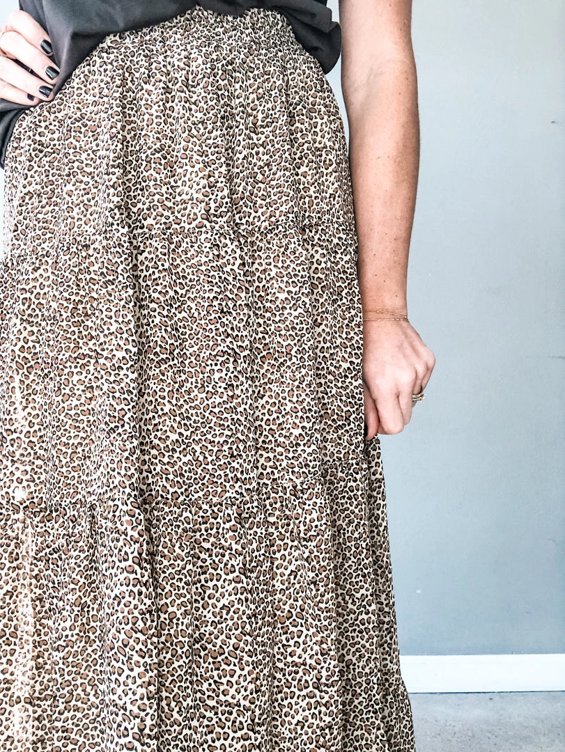 A tiered, gazuy midi skirt with elastic waist. Pair with a crop or your fav graphic tee for a casual look or dress her up for the office or a night out. A great staple leopard midi skirt that flows and moves so pretty and can be worn so many ways!