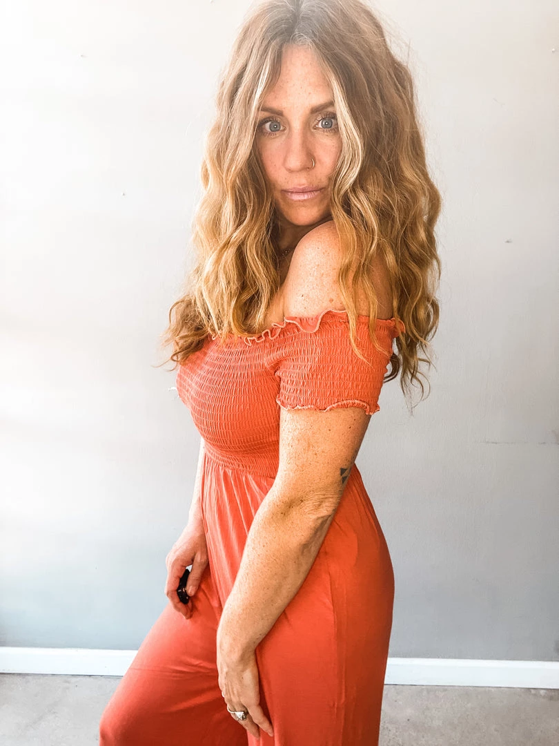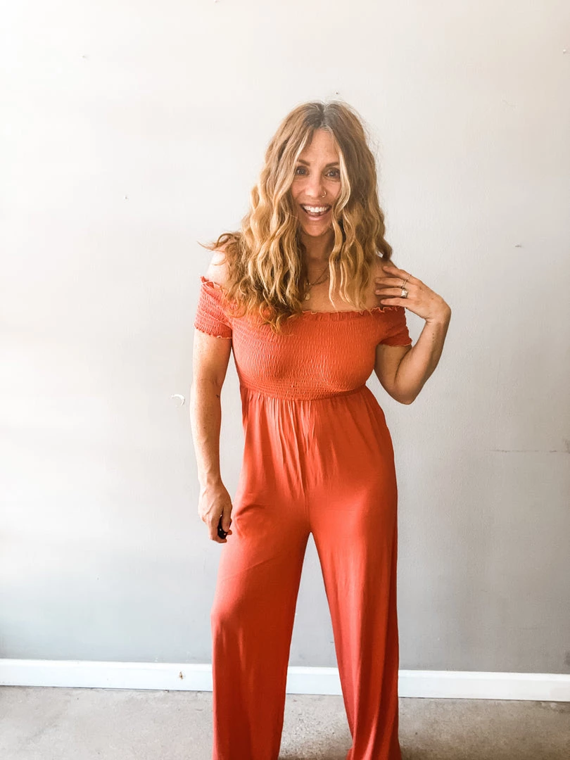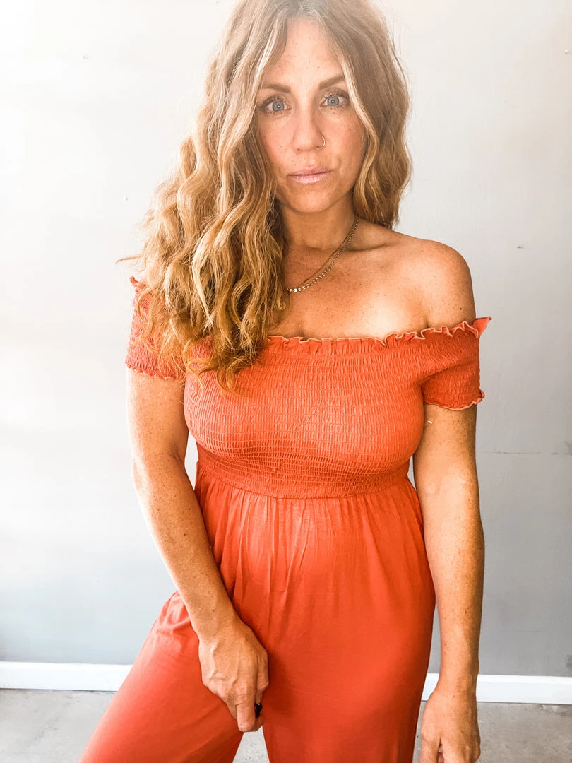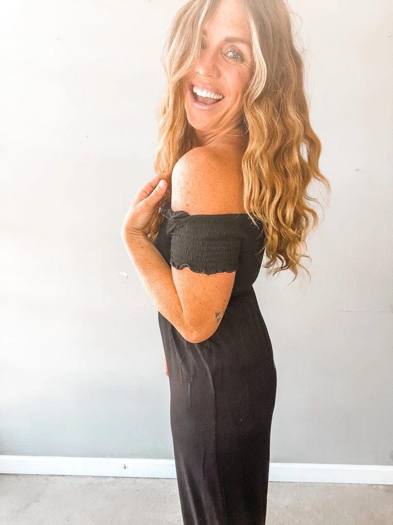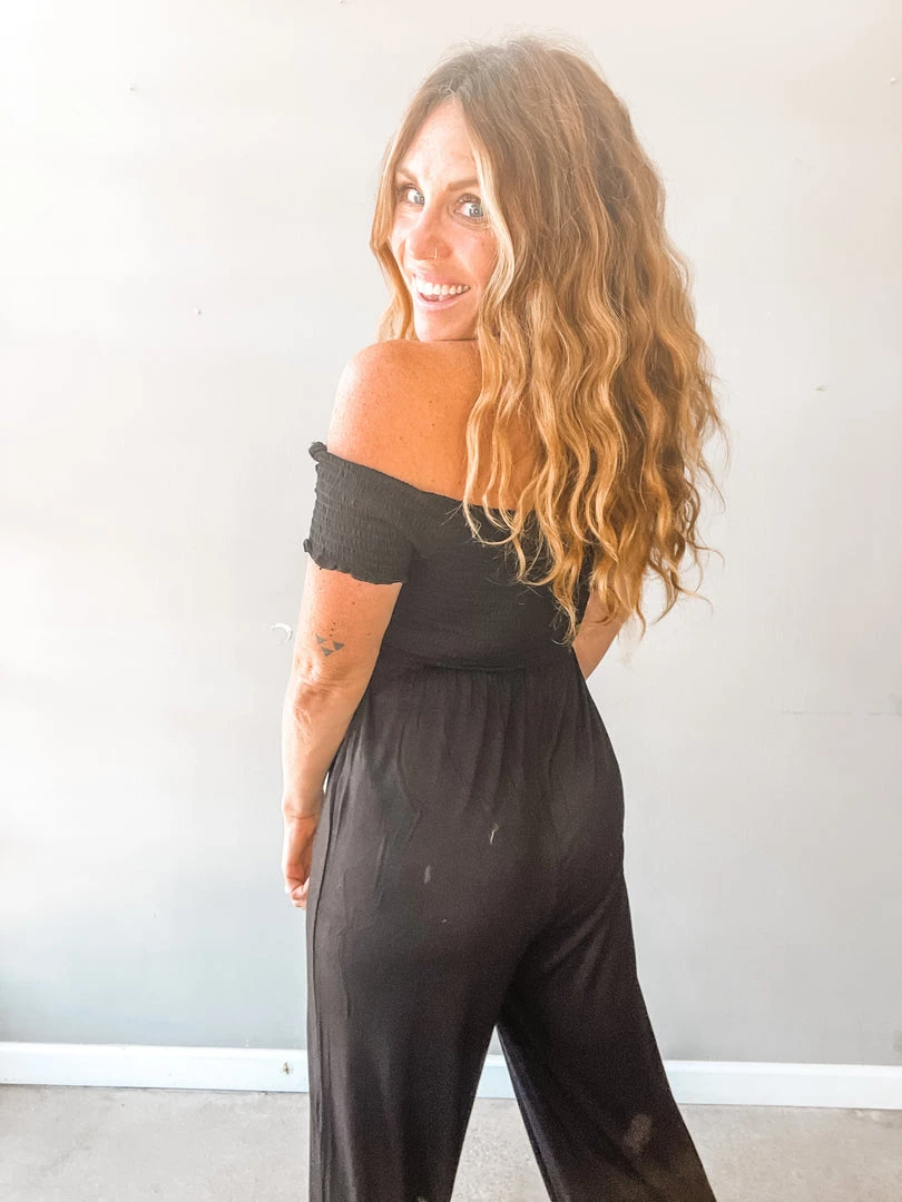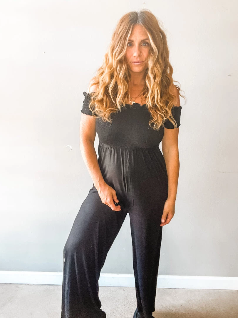A little luxe jumpsuit we absolutely love!! Smocked, off the shoulder bustline that provides just the right amount of uspport so you can go braless. Slight lettuce hem ruffle details in the shoulders and neckline keep this juicy 4 eva jumpsuit super fun and flirty. A slightly loose leg with empire waist. Plenty of stretch throughout and so comfy on but without sacrificing on any of the style. Available in two colorways.