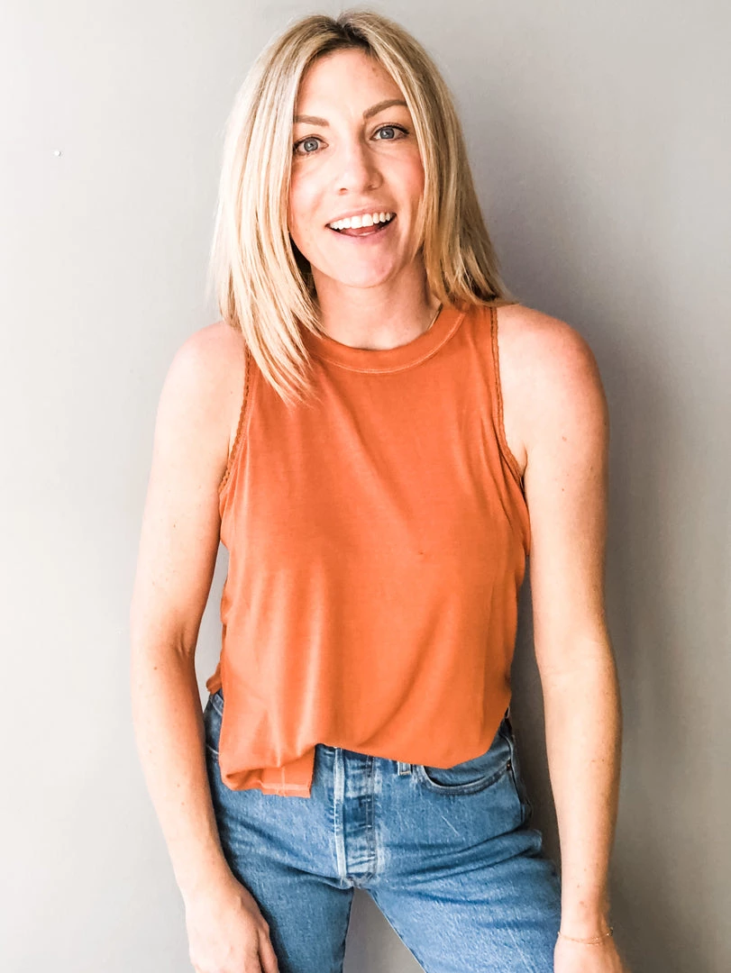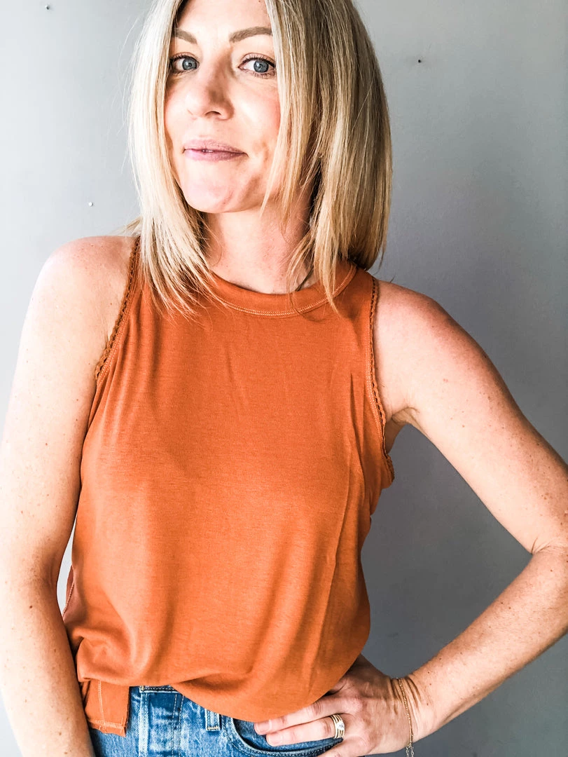 The Lace Trim Muscle Tank is a chic basic in a great pop of color that can transition well to any season! We love the dainty trim, high neckline, mini side slits (great for tucking in or wearing out) and flattering back seam line of this easy staple.