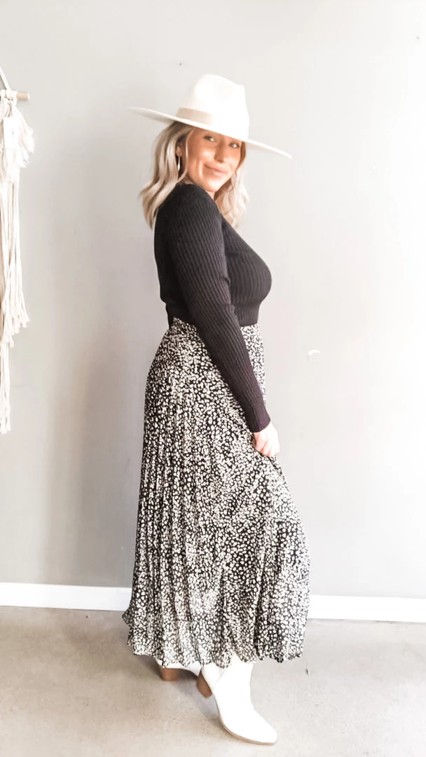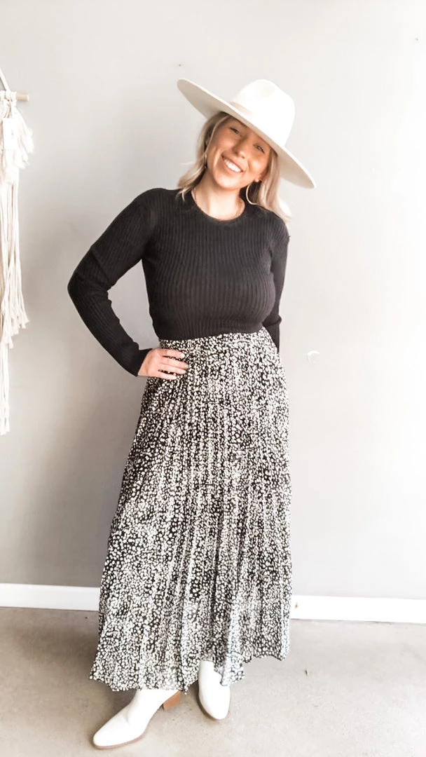 A pleated black and white leopard skirt with an elastic waist and midi length lining. Easy to pair and wear year round. A great wardrobe staple that is great for all body types.