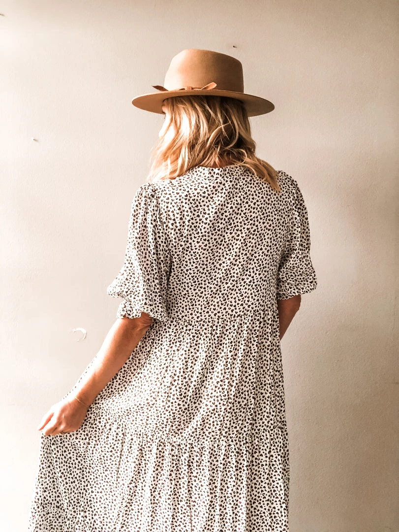 A leopard print henley dress with front buttons, pintuck detail, elastic ruffle sleeves and a 3 panel tiered skirt. So easy to transition from summer to fall in this easy to wear dress.