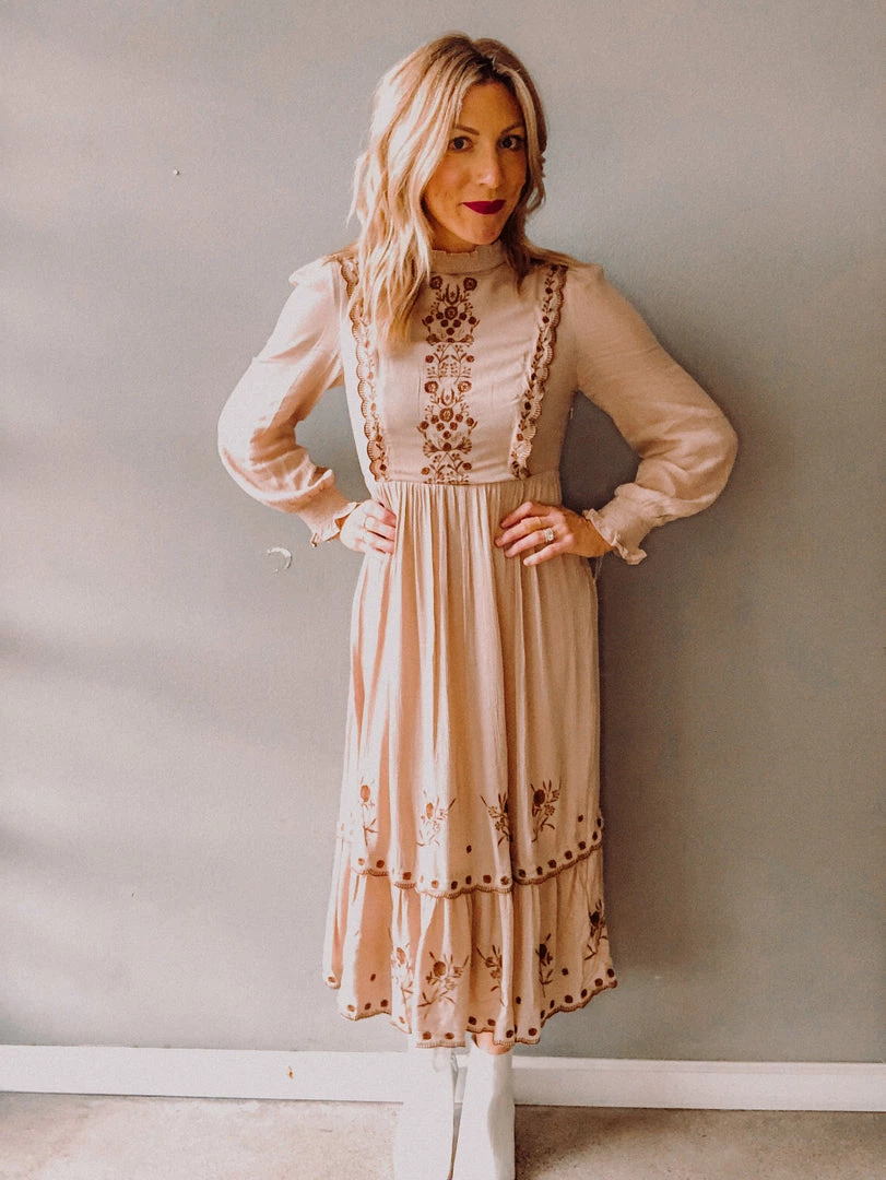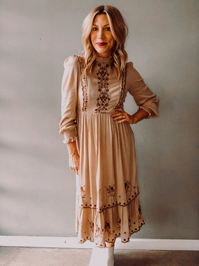 A high neck emboridered midi dress with loose fitting sleeves and stretchy wrist hem. Absolutely love the boho vibe of the dress and all the fun details. Button closure at the neck with side zipper. A perfect family photo dress or one for the holidays!