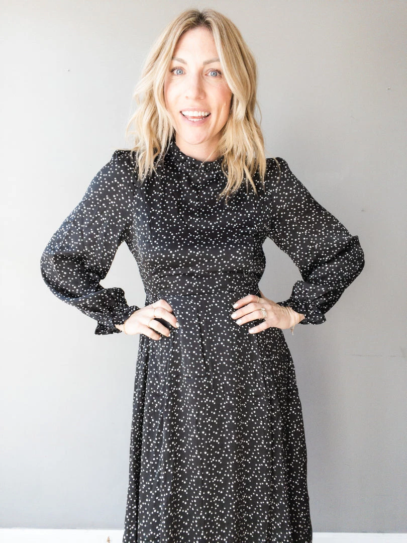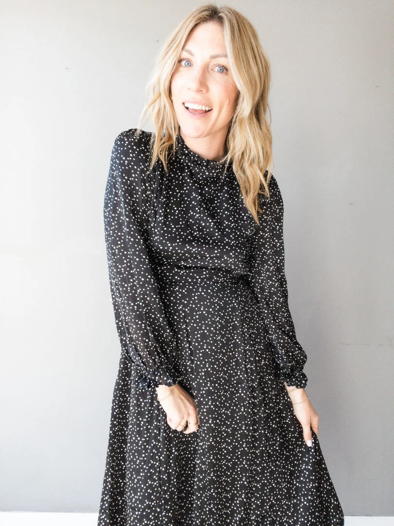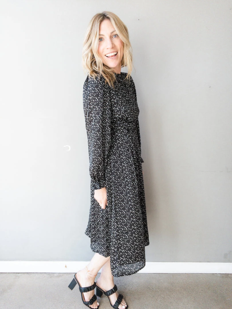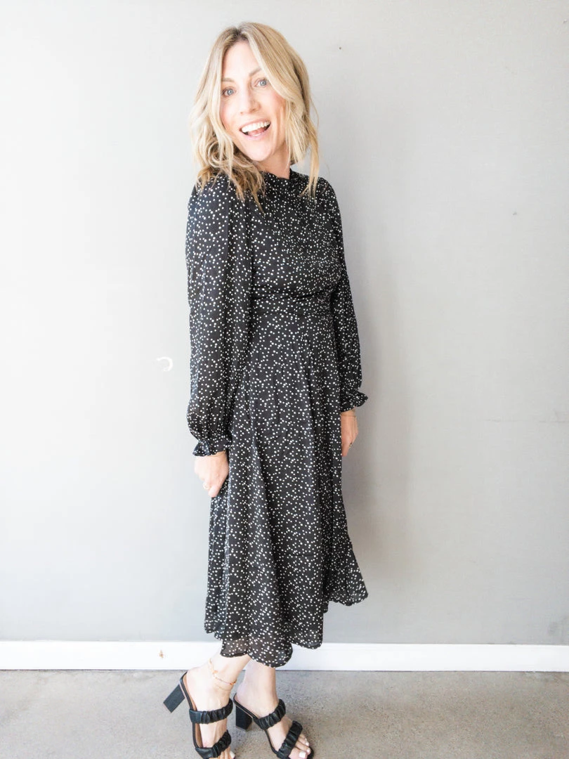 A beautiful mock neck midi dress that we absolutely love!! With a pretty satin polka dot print that is the perfect neutral to wear to any wedding, bridal shower or special occasion this season! Ruffle details at the neck and sleeves make for some ultra feminine details with a flirty button down open back and side zipper closure. Feminine, sophisticated and a tad flirty all rolled into one stunning dress.