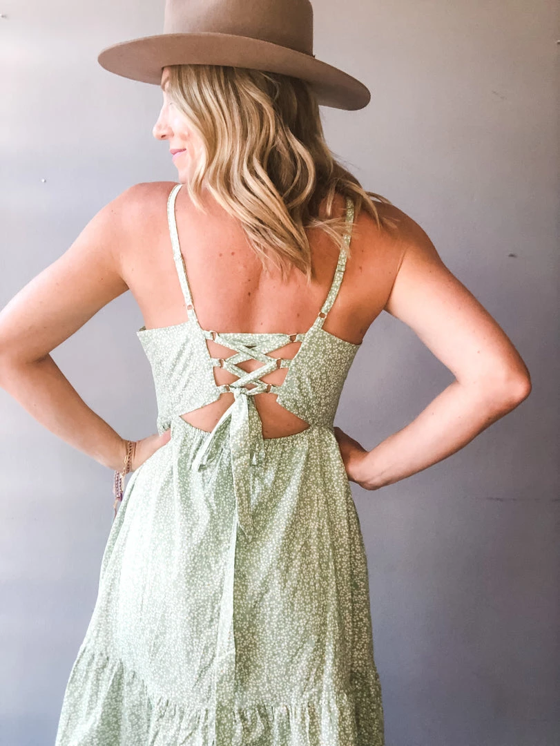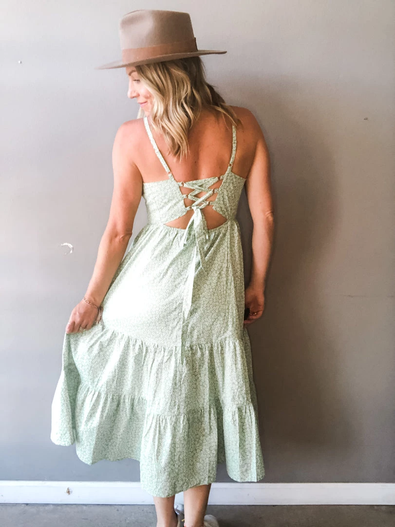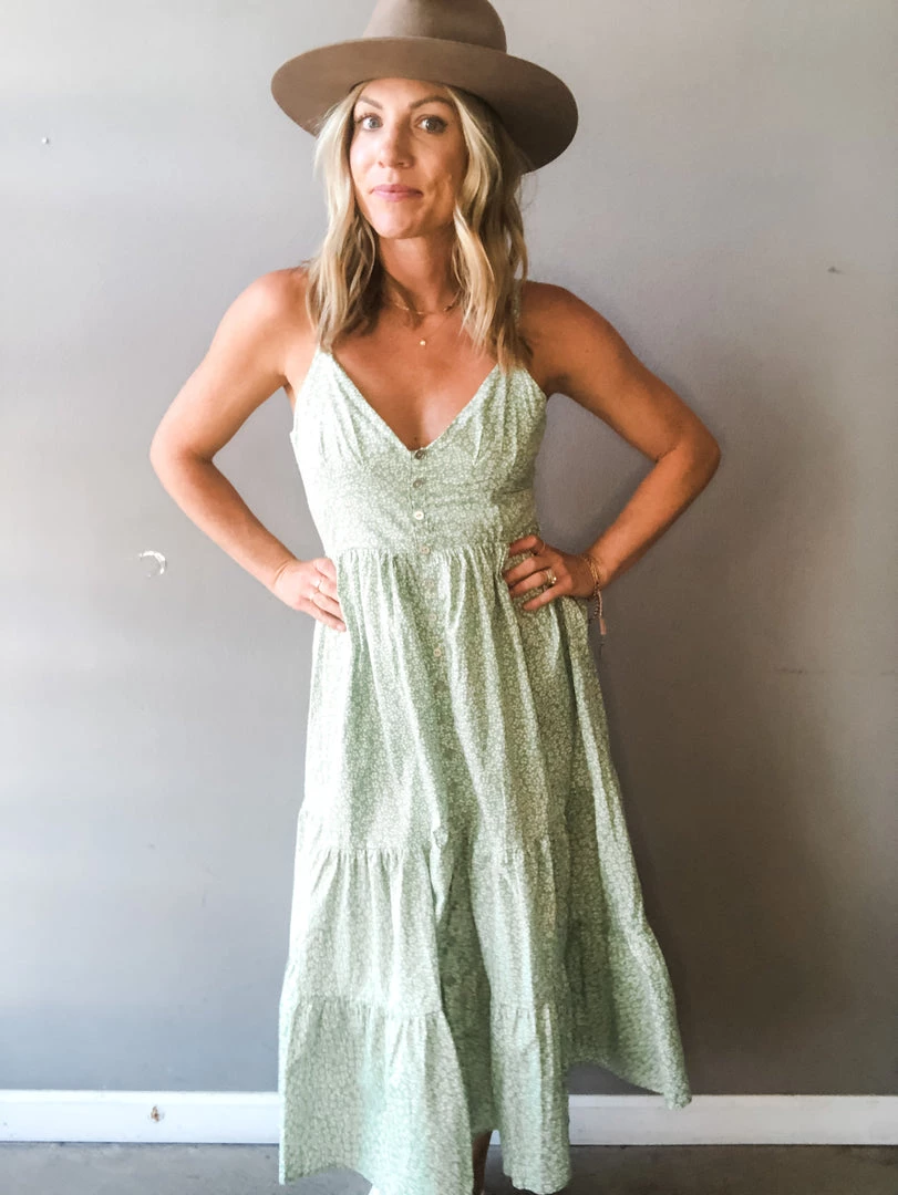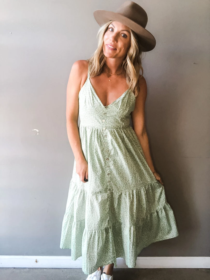 The sweetest midi dress with an all over daisy floral pattern on a green tea fabric. So many details to love. Functioning front buttons with v-neck, adjustable spaghetti straps, elastic back with lace up detail and zipper closure. Feminine and a little bit retro and a little bit country, she can be worn so many ways! Lined.