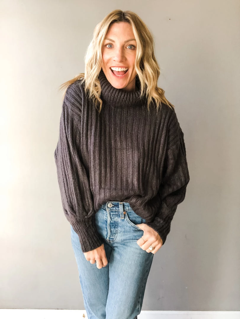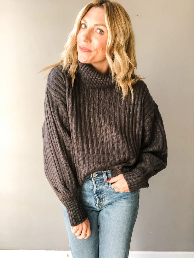 The perfect basic turtleneck!! This charcoal knit looks great paired with jeans for a casual look we love to reach for time and time again or dressed up with a great tiered midi skirt. A loose fit in the body for easy all day wear with lantern style sleeves that end in a wide banded wrist.