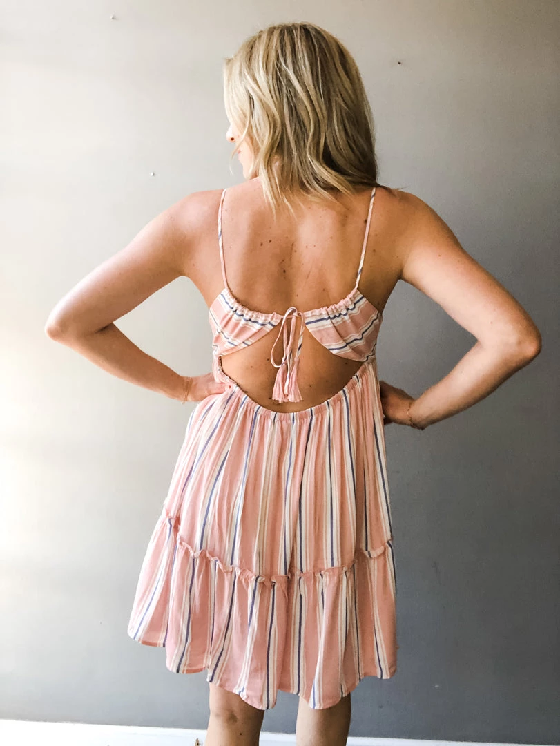 A sweet striped mini dress with a killer tie back detail that seals the deal! With a v neck, tiered skirt and adjustable tie back with scoop cut we are ready for sunny days in this sweet dress. Dress up for a special occasion or pair with a denim jacket and sneakers for a casual look.