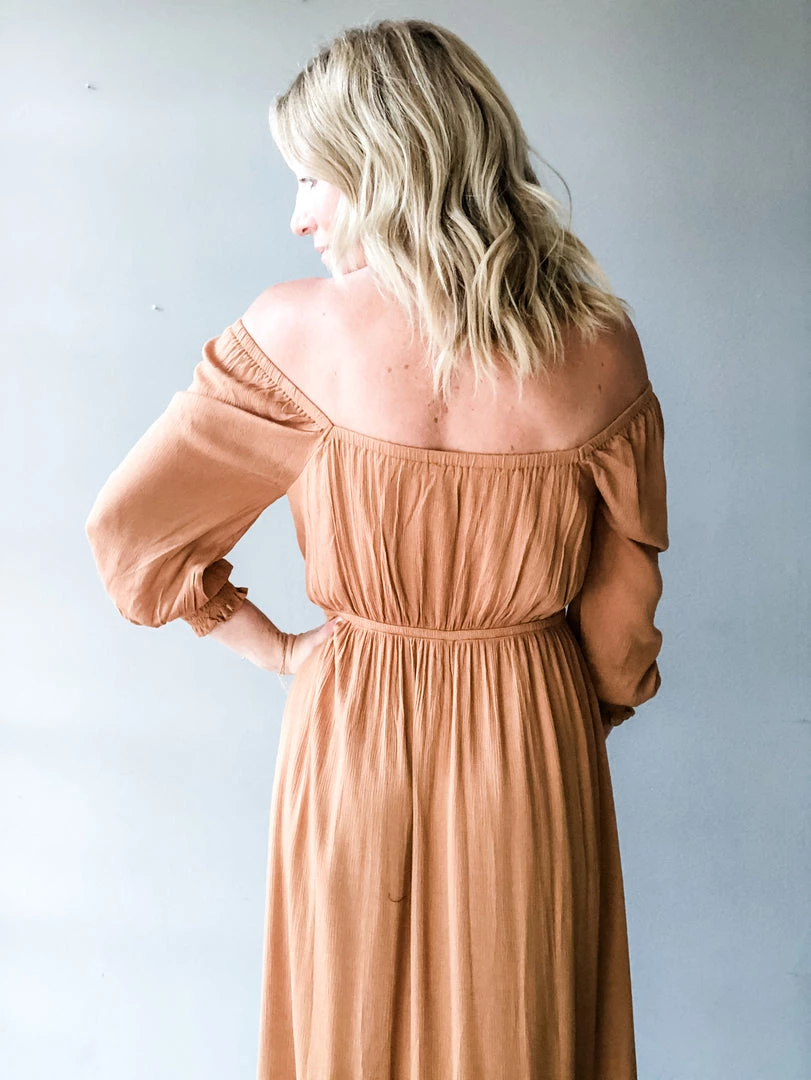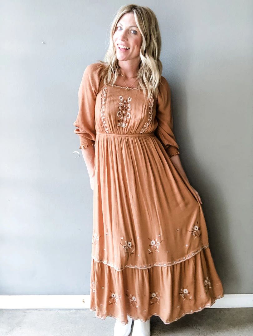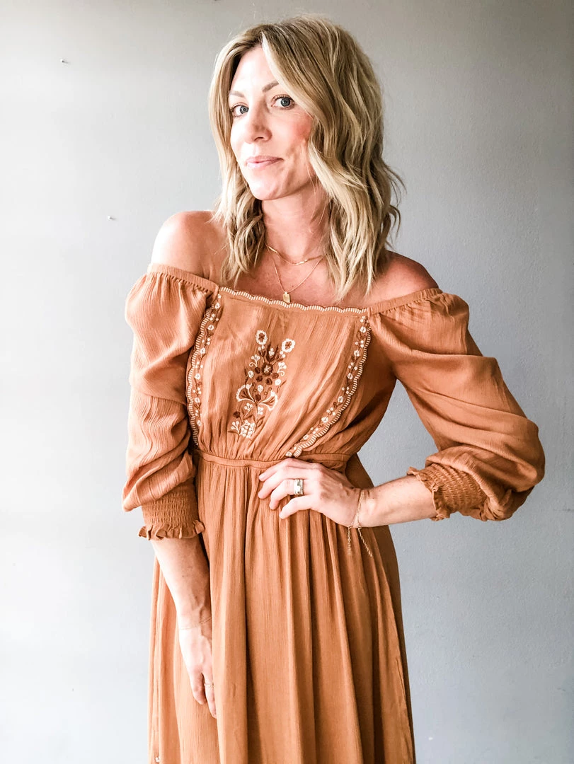 A boho style maxi dress with floral embroidery our feminine hearts can’t take. She is sweet but can be sassy. A loose fitting 3/4 sleeve with ruffleĀ detailĀ andĀ elastic hemĀ that can be worn square or off the shoulder. Paired with the Spade booties and we are swooning.Ā