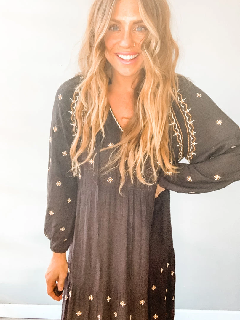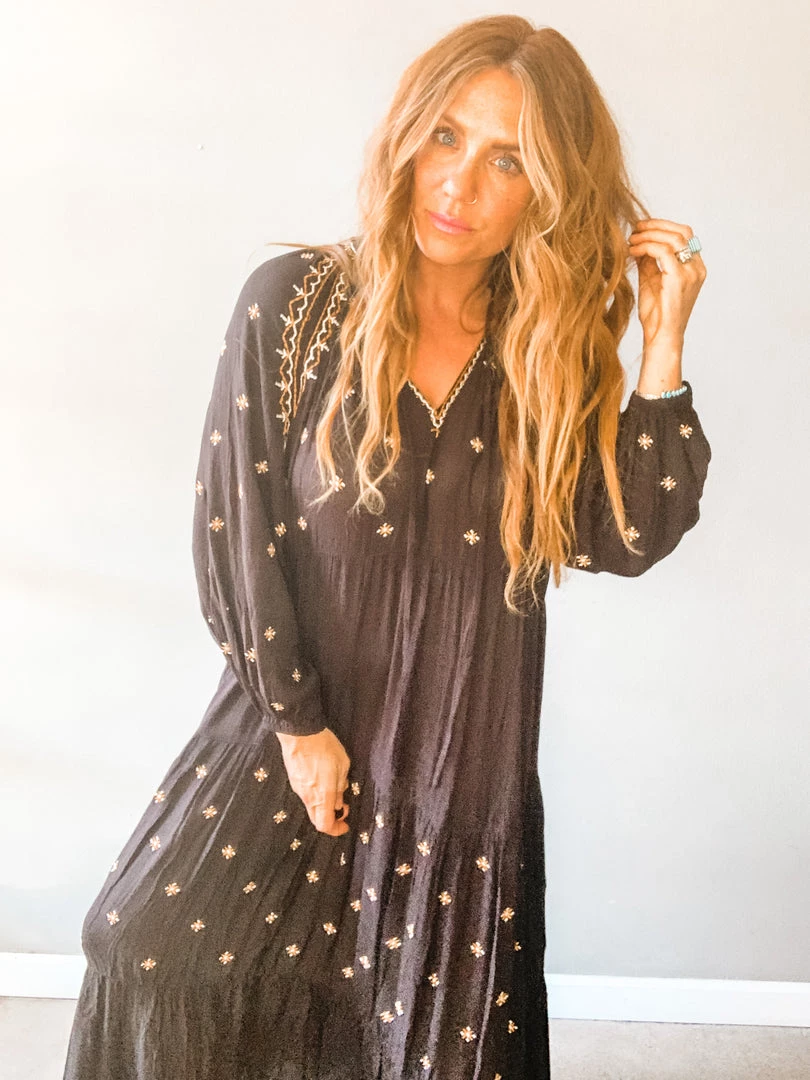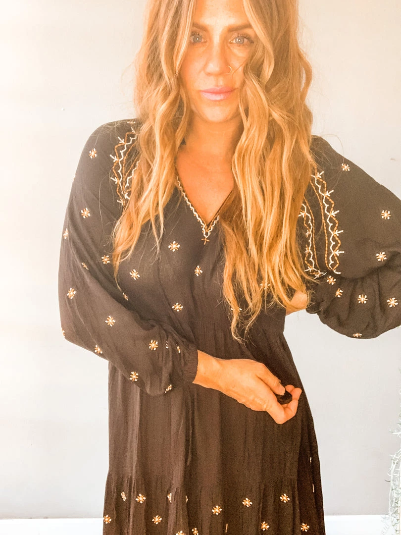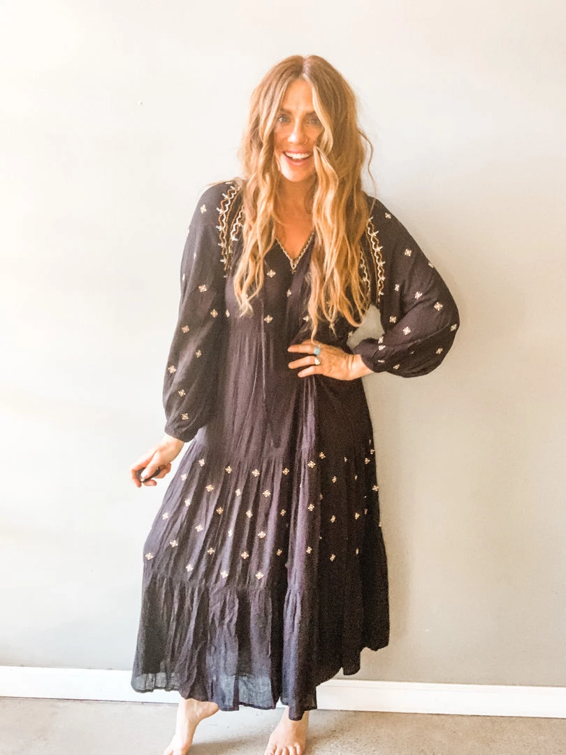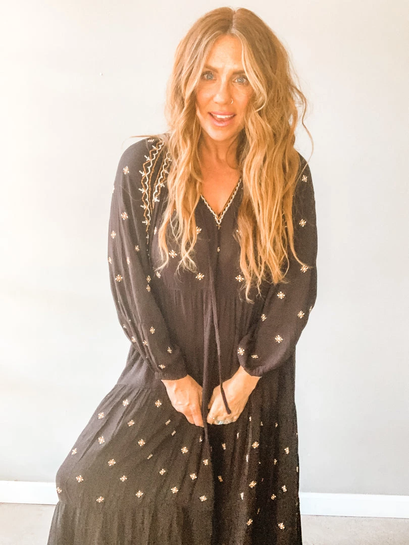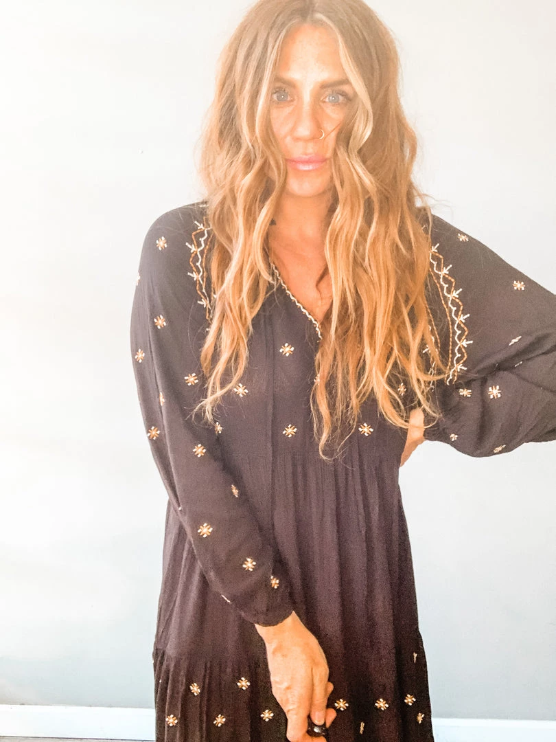Free Bird Free Dress is A flowy, bohemian delight. A great breezy, tunic style, long sleeved dress with embroidery details. I love this look barefoot (shocking) but so cute with a strappy sandal or boot. No undergarments needed. Right up our alley.