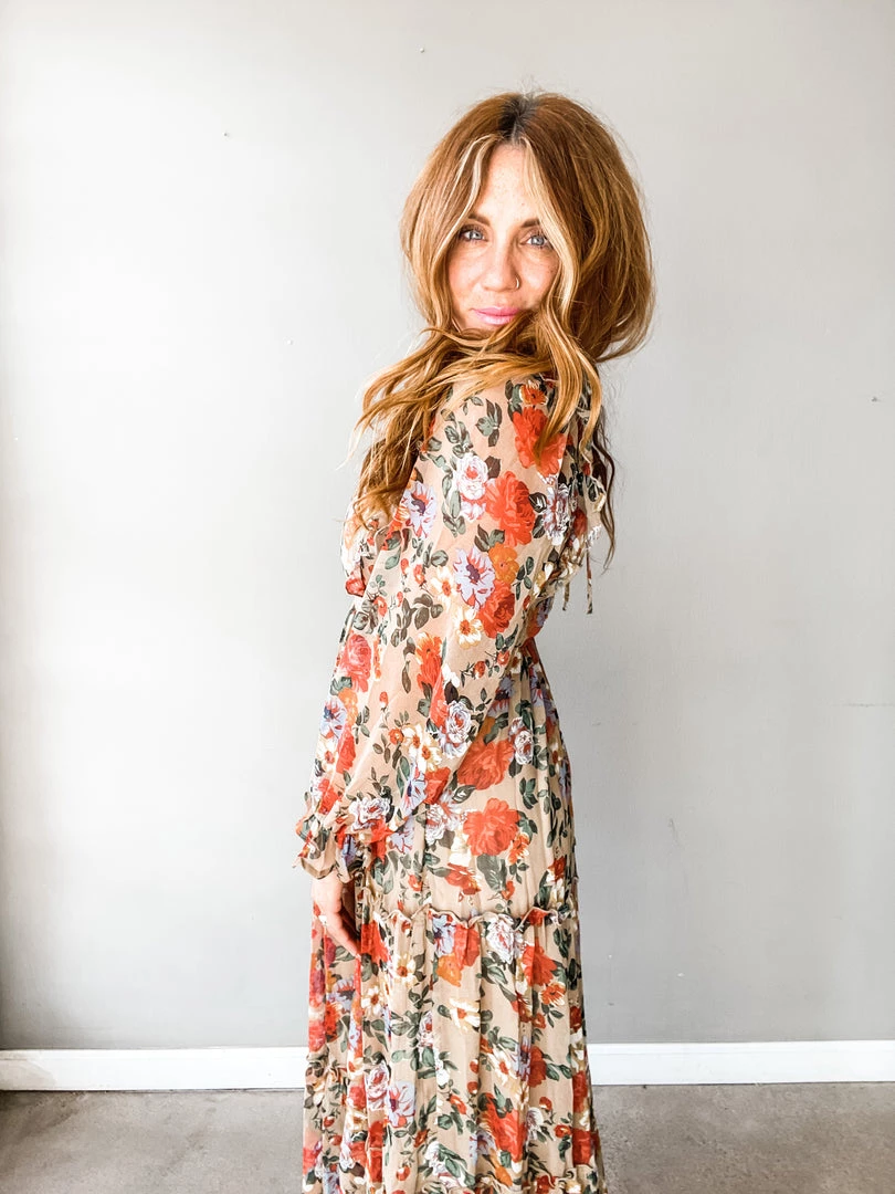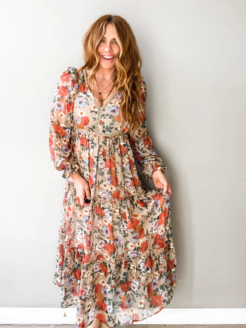 A beautiful garden floral maxi dress with v neck lace insets, ruffled shoulder accents and tiered skirt. Loose fitting sleeves with smocked wrists, side zipper, elastic waist and smocked back for a good fit on varying body types. A sweet boho style dress we love to pair with booties and a wool wide brimmed hat or wear with bare feet and hang in your backyard looking fly.