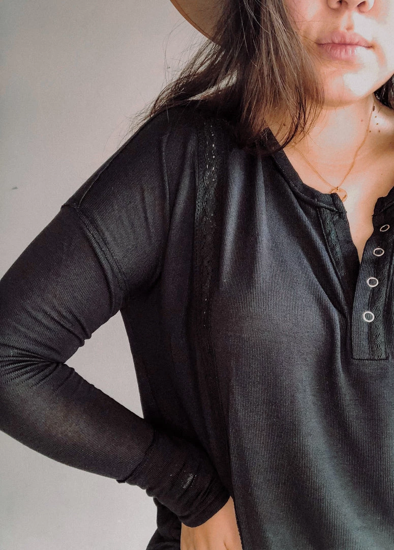 This henley long sleeve gives us some seriously sweet vibes with all its lace trim details. A button v-neck and open-knit texture throughout keeps this top breezy and easy to wear. The Here Today Knit has fitted sleeves with trimmed wrists and loose silhouette. Keep things easy and carefree and toss on your best wide-brimmed hat and favorite denim with this knit.