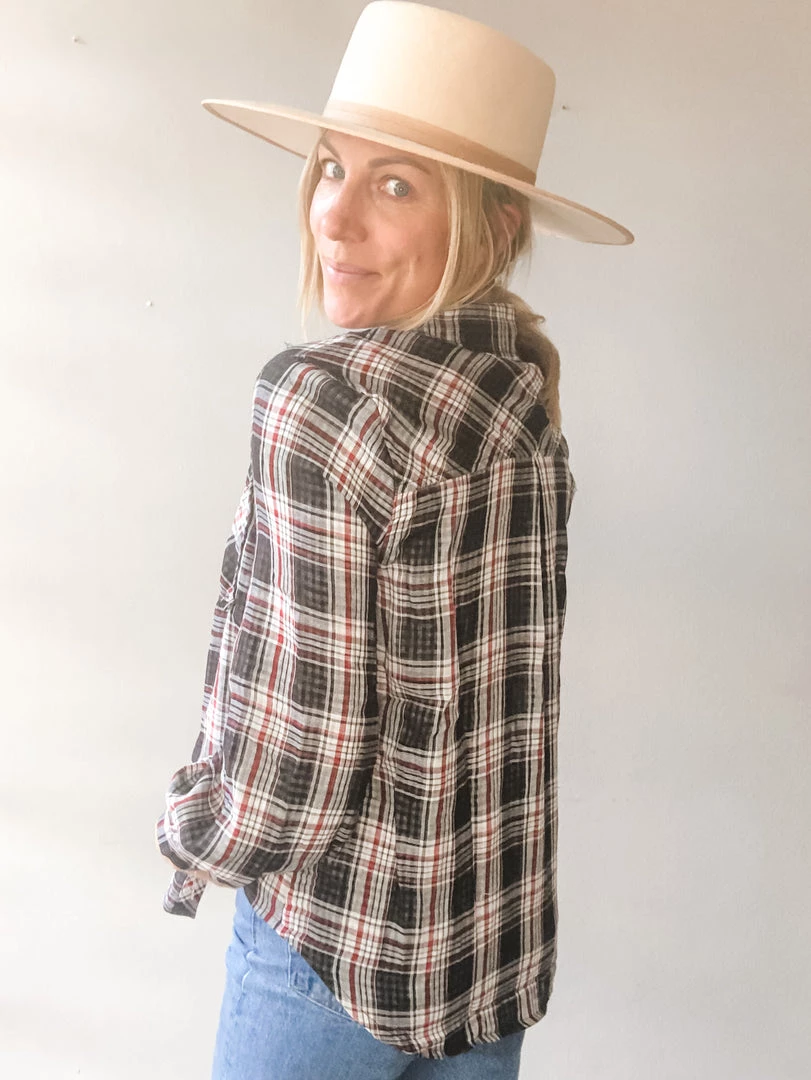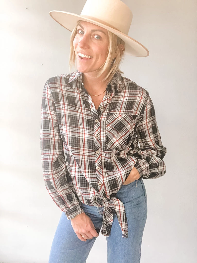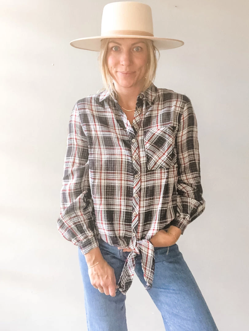 A sweet little tie front plaid button up with scoop hem in the back. A forever favorite, we love how easy this long sleeve is to wear for any age or body type. A classic plaid in charcoal, black and red is great for the holidays!