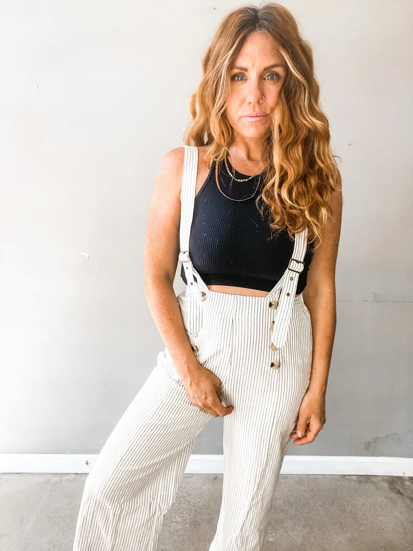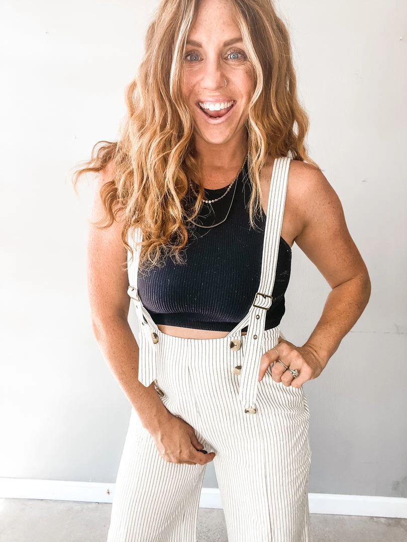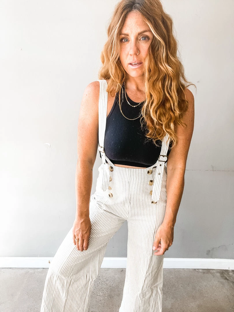 The Lady Luxe PInafore Pants is such a fun piece to mix up your wardrobe with! We love these chic cream and white striped pants with button details and overall-style strpas. So cute paired with a grpahic tee or crop underneath!! A cropped hem perfect for pairing with sneakers or boots. Elastic waist with zip closure.