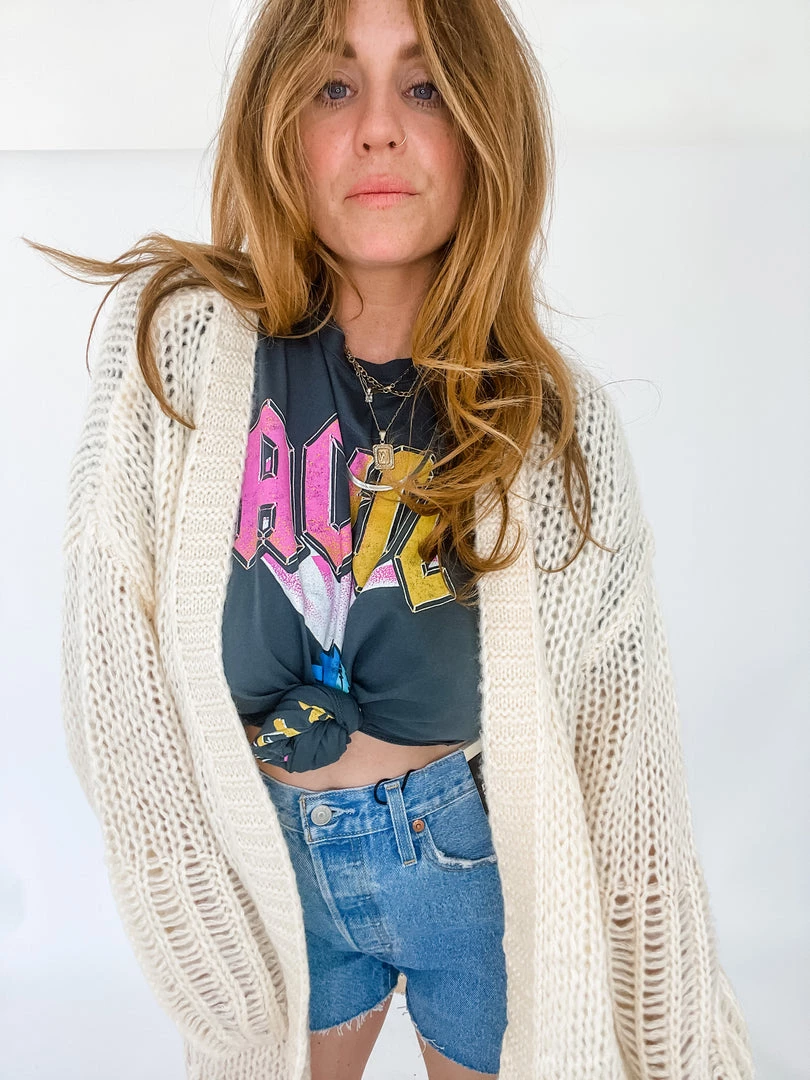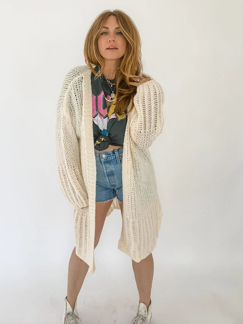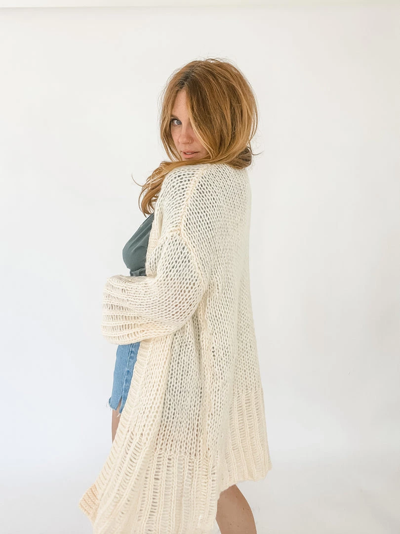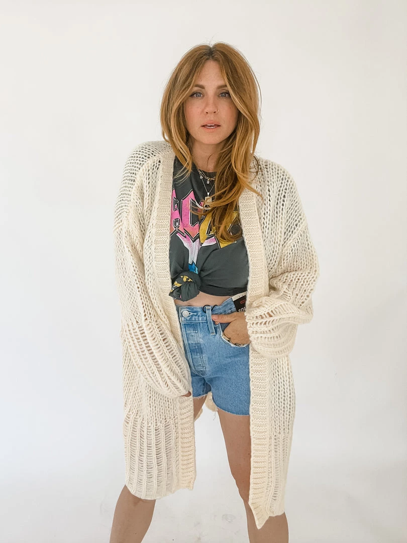 A light weight cream knit cardigan with balloon sleeves and contrasting stitching along the hemlines. Open front that perfectly layers over a tee and cutoffs on a cool summer night.
