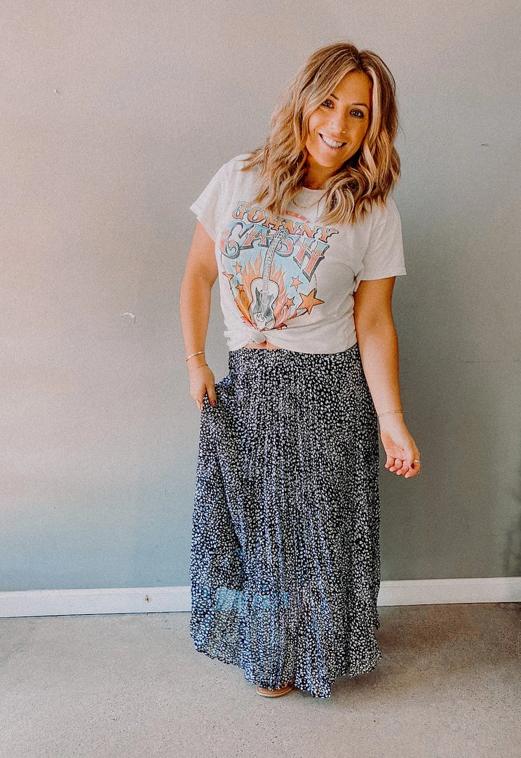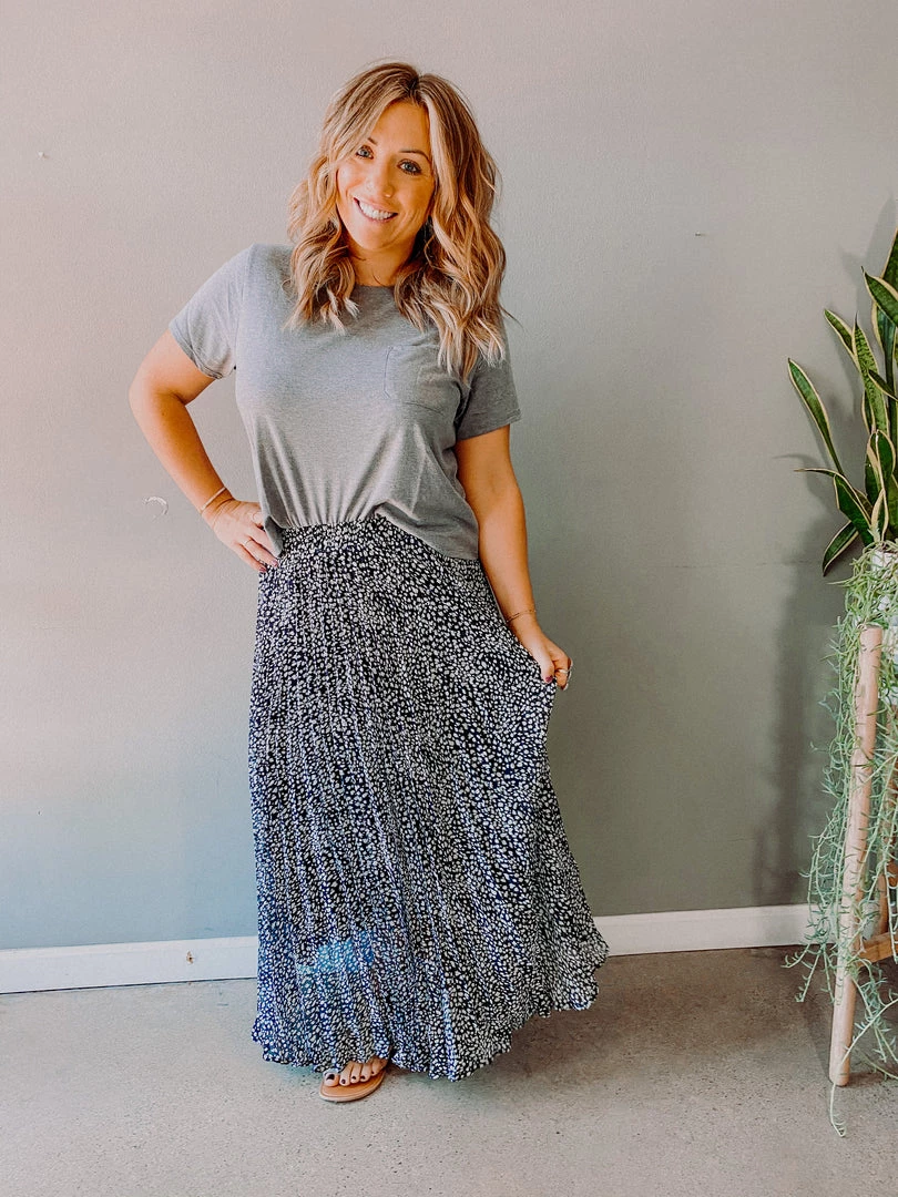 This beautiful pleated maxi skirt comes in a chic leopard print that pairs so well with a solid basic (crop top or bodysuit) or with your favorite graphic tee! We love the long flowy movement of this beautiful skirt…great to dress up or down and such an easy piece to have in your wardrobe for any occasion.