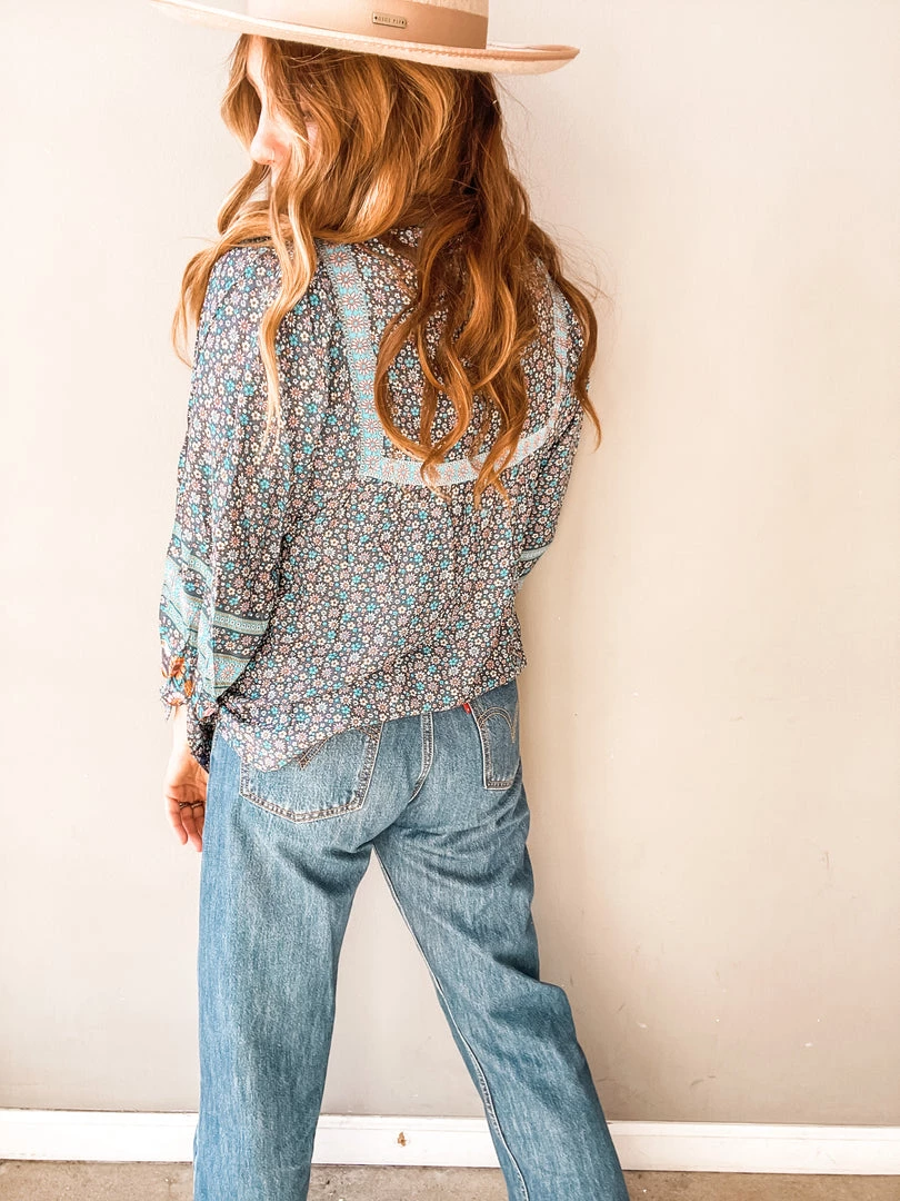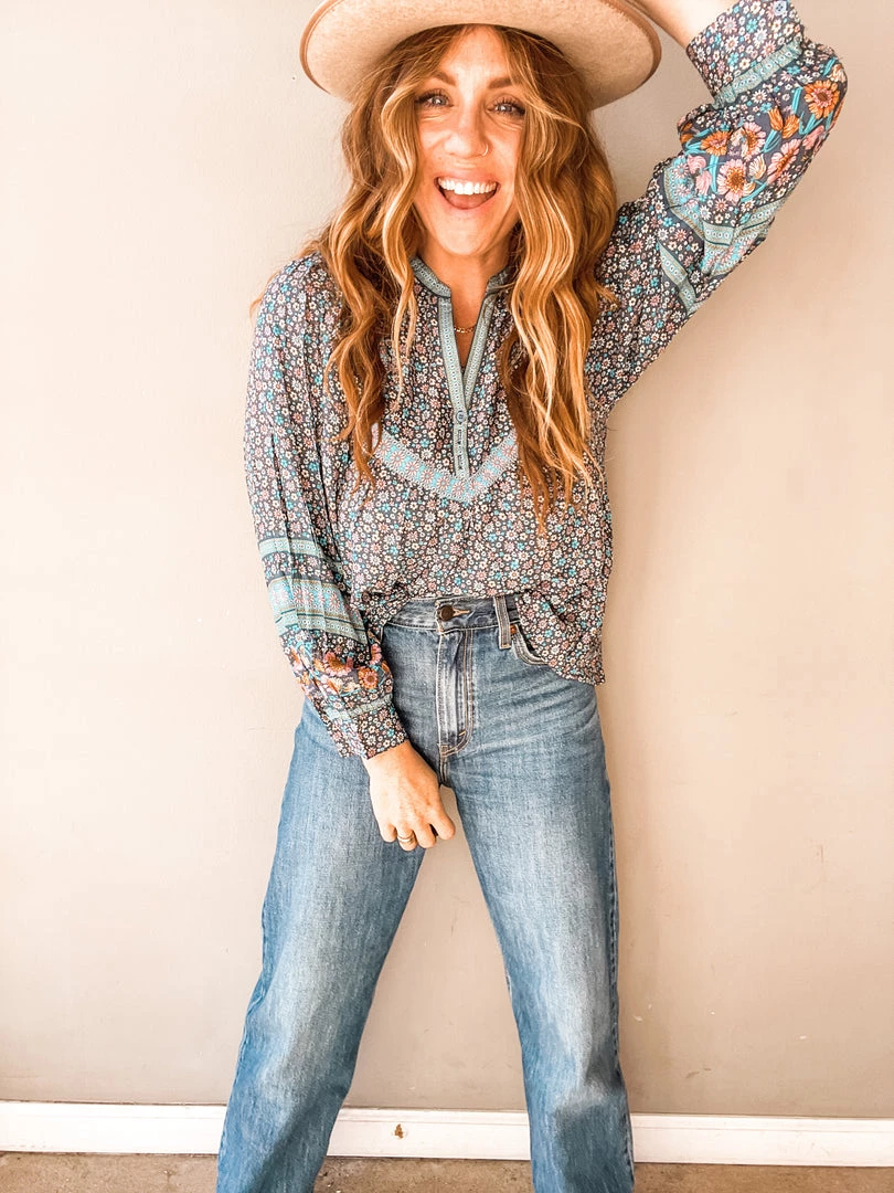 Calling all Queens of the South, lookin for the perfect lil boho blouse to go with all your favorite denim!!!! This loose fitting blue floral blouse is everything we love about a classic piece. Pretty and feminine, flowy and fun, this great blouse looks so cute tucked into your high waisted jeans with a your best boots on.
