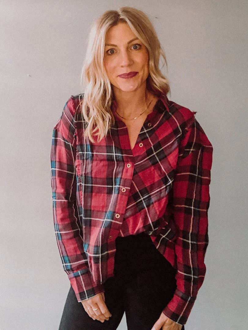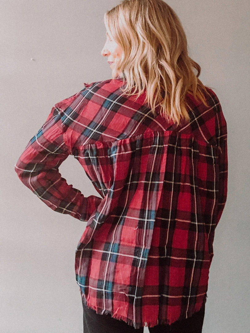 Not your typical flannel shirt, this long sleeve button up shirt has a fun feminine vibe with raw hem details. Pair with jeans or open and over a graphic, this loose fitting top is perfect for the cooler weather ahead.