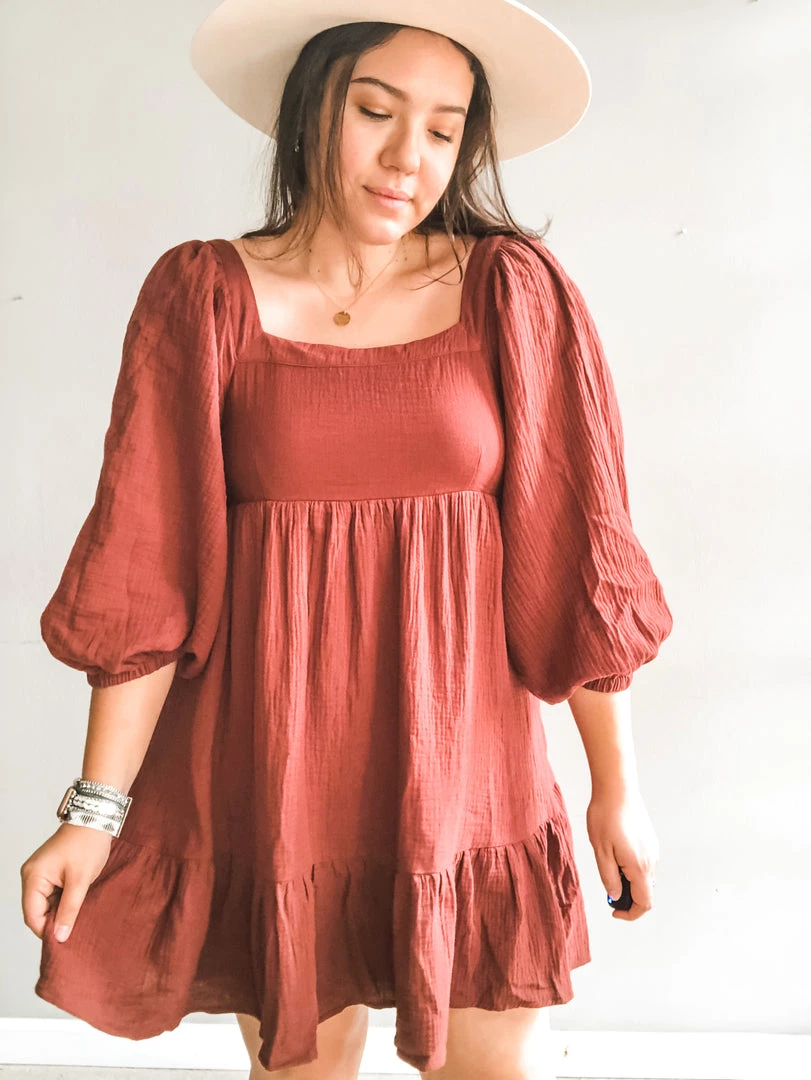 This gauzy square neck mini dress is what Autumn dreams are made of! A gorgeous terracotta colorway that we love for the fall. This babydoll style silhouette features a sweet tie back and banded bubble sleeves. A dress that was made to be paired with your best booties and go-to brimmed hat.