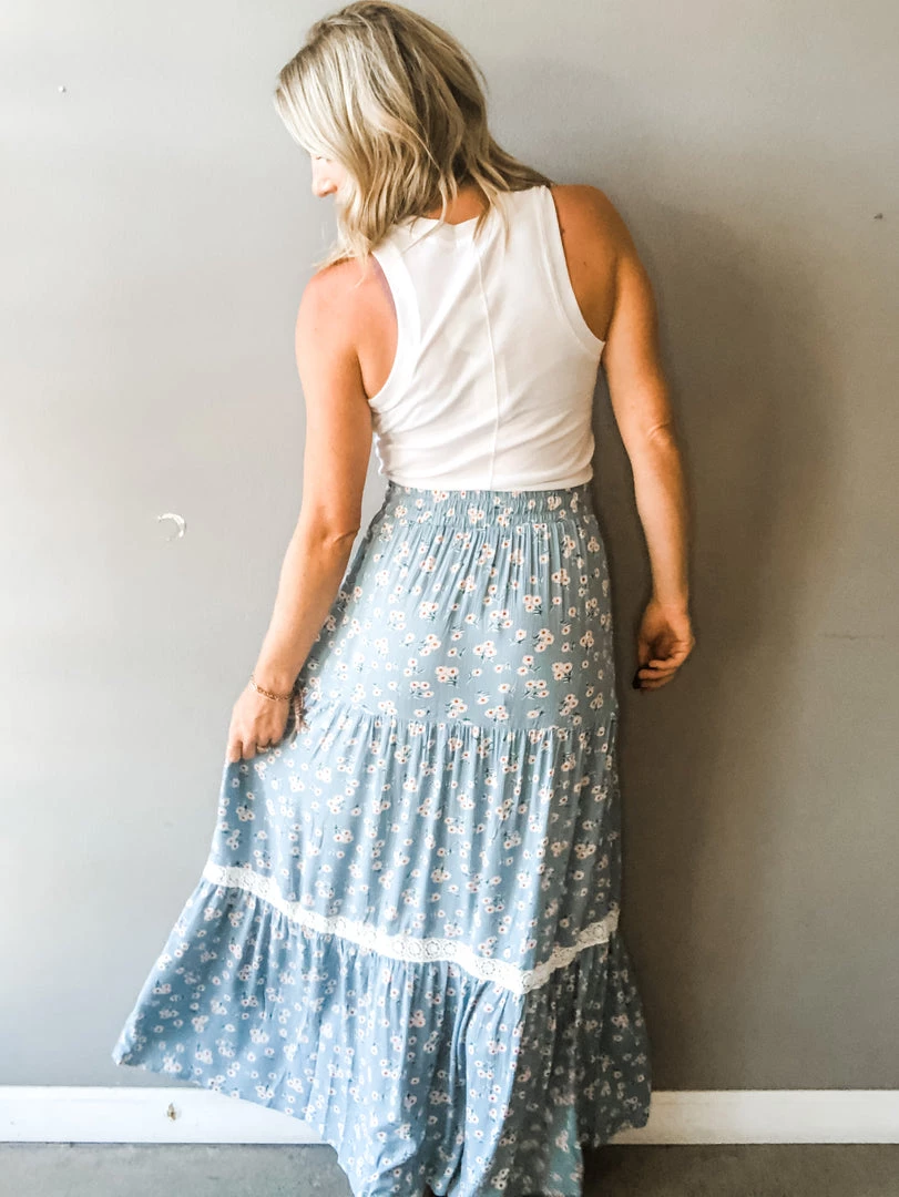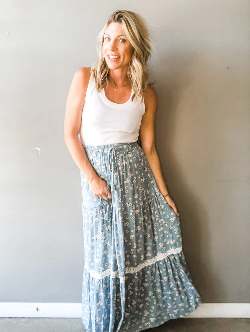 An all over print floral maxi skirt with lace inset, elastic waist with drawstring and tassel detail. This flowy, tiered maxi skirt is such a great staple for any wardrobe. Pair with a basic tank or tee or your favorite graphic and booties or sneakers. It is versatile and timeless. Easy to dress up or wear casual, making it a must have for everyone!