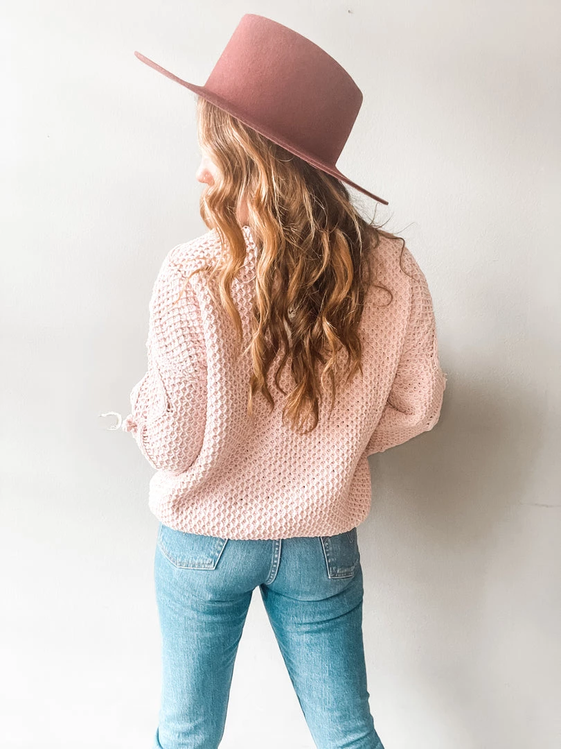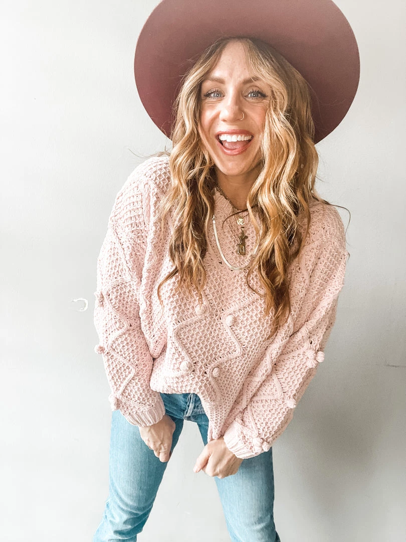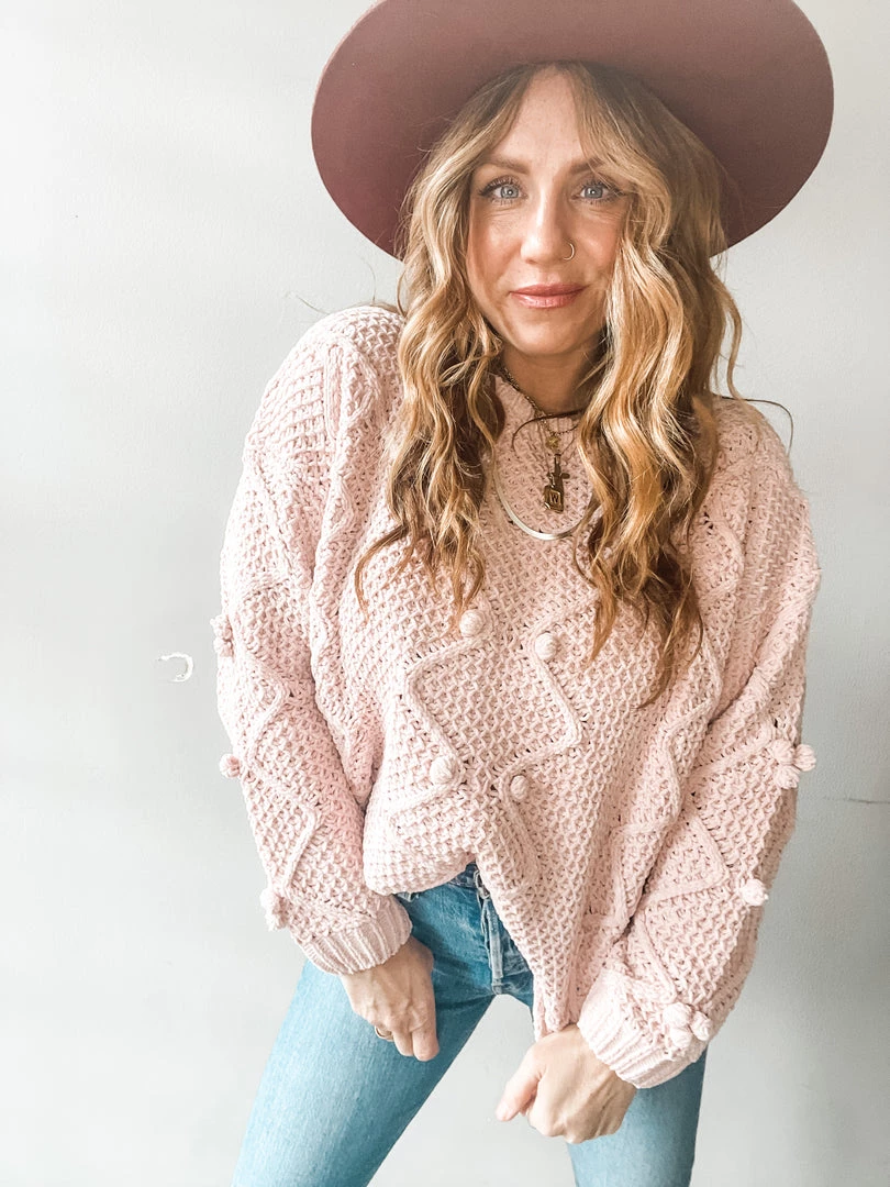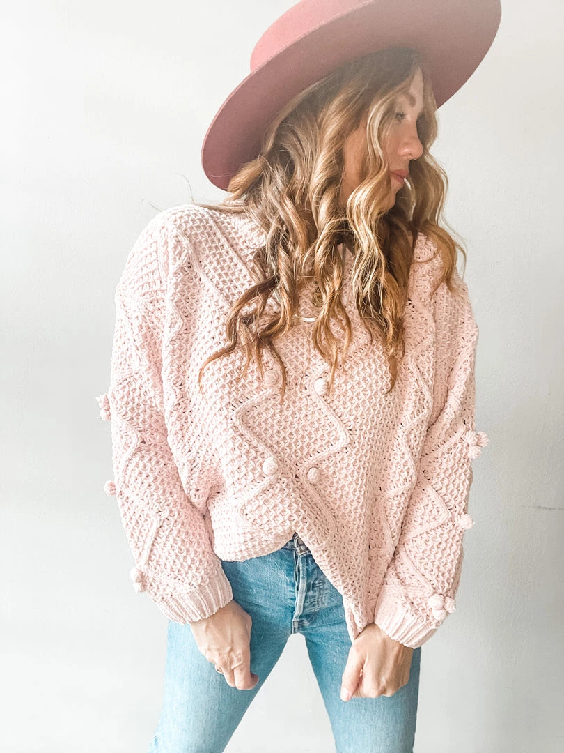 The Secret Garden Sweater is a super sweet and feminine matte chenille cable knit sweater in a perfectly dusty pink colorway with textured pom accents.