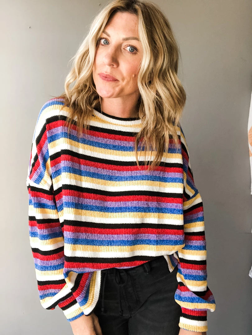 A multi-color striped chenille sweater with lantern sleeves that gives us all sorts of throwback vibes!! This yummy knit has a wide crew neck and slightly boxy hem, so it’s perfectly loose in all the right places. Wear this bright sweater with any great denim and wear tucked in or loose.