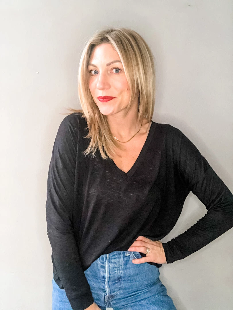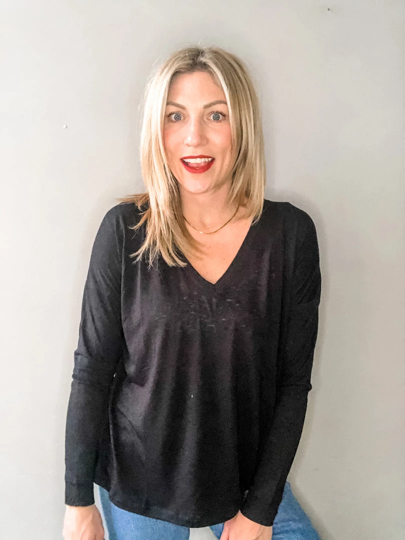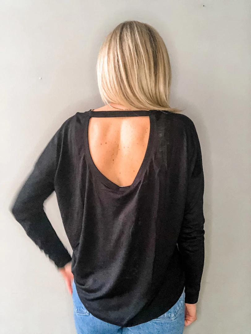 A lightweight v neck long sleeve with low back detail we love. Perfect with denim or thrown on for a work out, this top is versatile and great for warmer winters or layering under jackets. A season staple for every wardrobe.