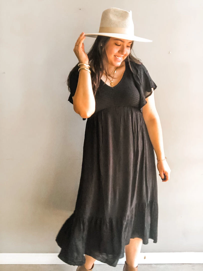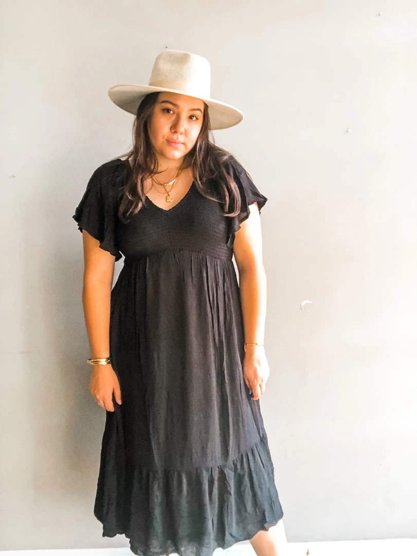 The type of dress you’ll reach for, for every and any occasion. It’s one of those closet staples that will never let you down. So flattering and the comfiest thing you could toss on with its smocked bust and easy silhouette. We love the feminine details of the flirty V neckline, ruffle sleeve details and tiered hemline. Dress it up or down, no there’s no wrong way to wear this beauty.