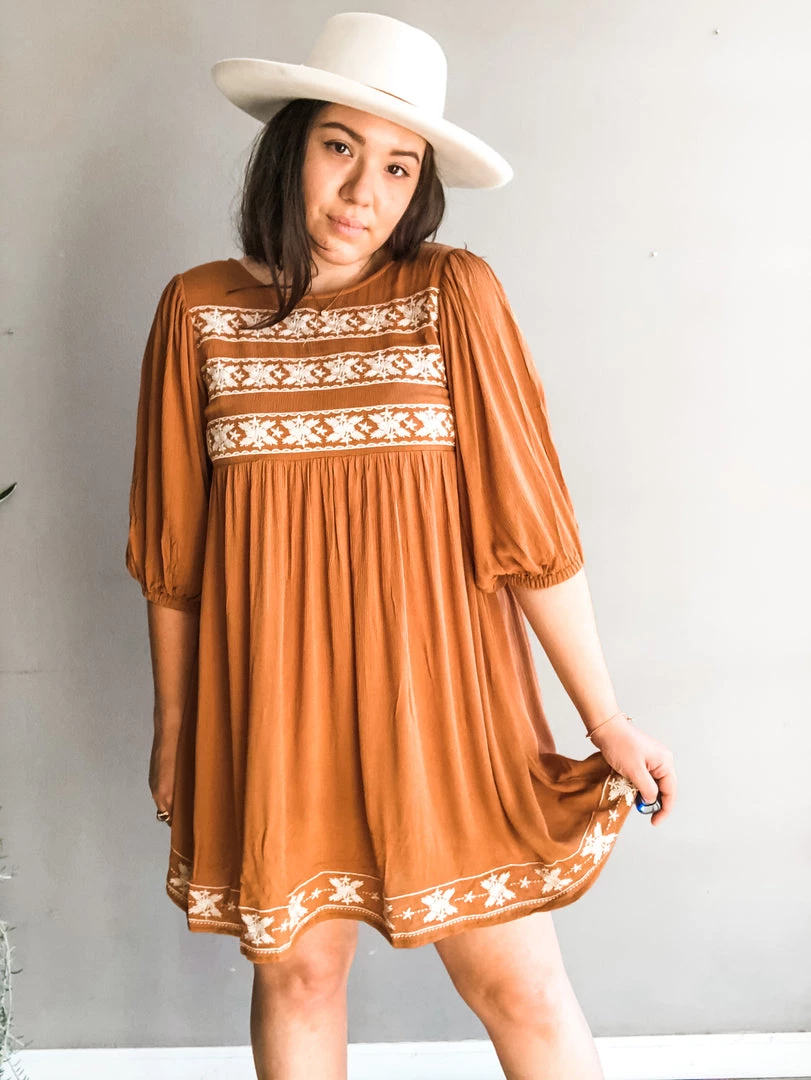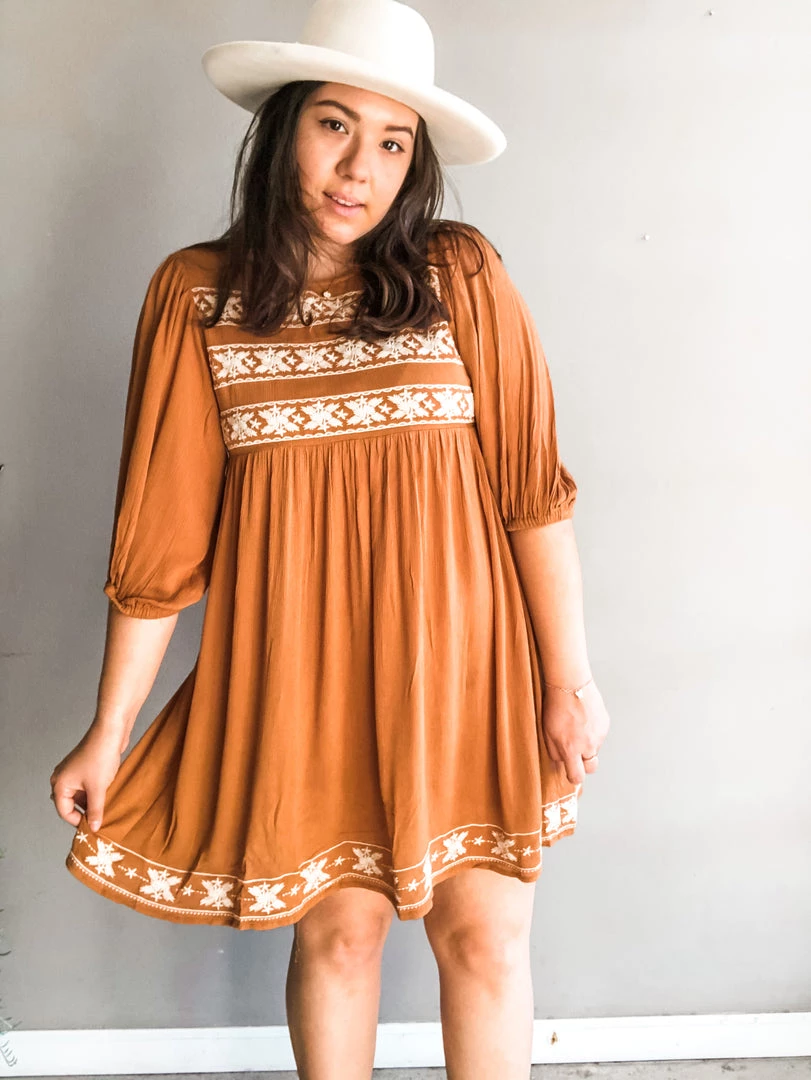 The Sutton Babydoll Dress is such a flattering fit!! An easy breezy style with its flowy silhouette. an dsweet as sugar cane embroidered detail through the bust and hemline. This sweet dress hits just above knee and has elasicated wrists with sweet tie back details. This dress does double duty as a sweet weekender piece or a staple for those family photos you’ve got coming up.