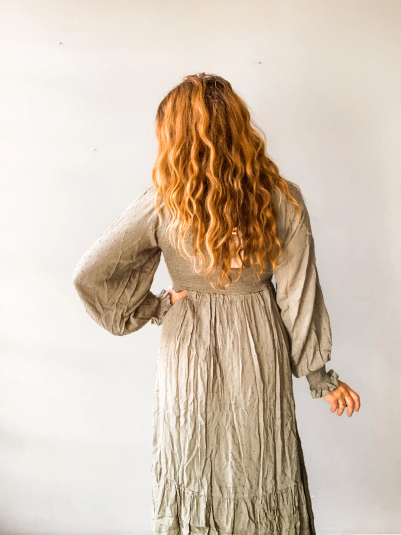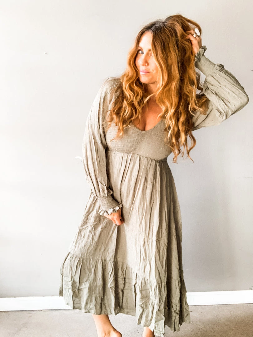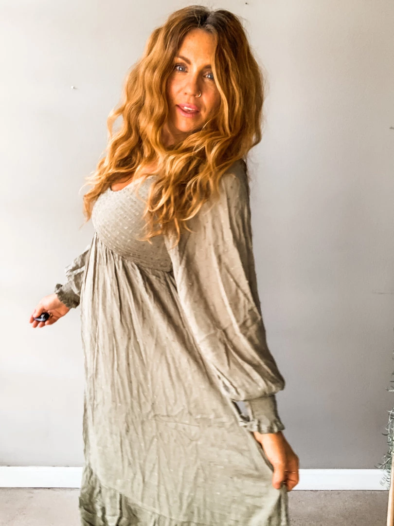 The Isabella Midi Dress is a SUPER flattering silhouette in a gorgeous olive green colorway! We love the fitted, smocked bust and sleeve of this easy fitting piece! Doulbe lined and a great option for a bump or holiday pics!!