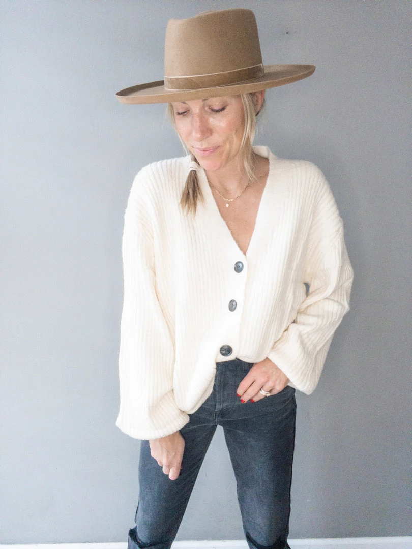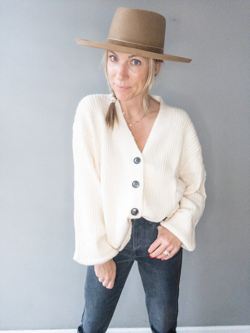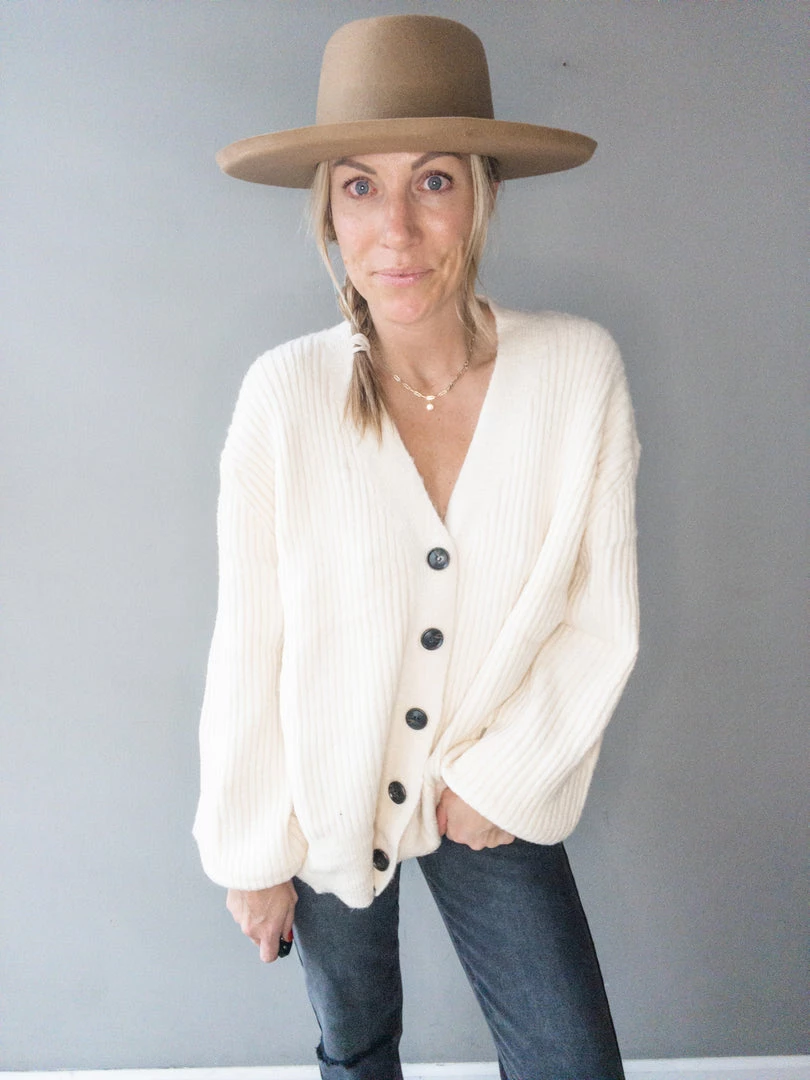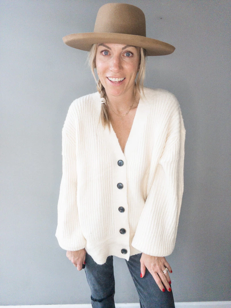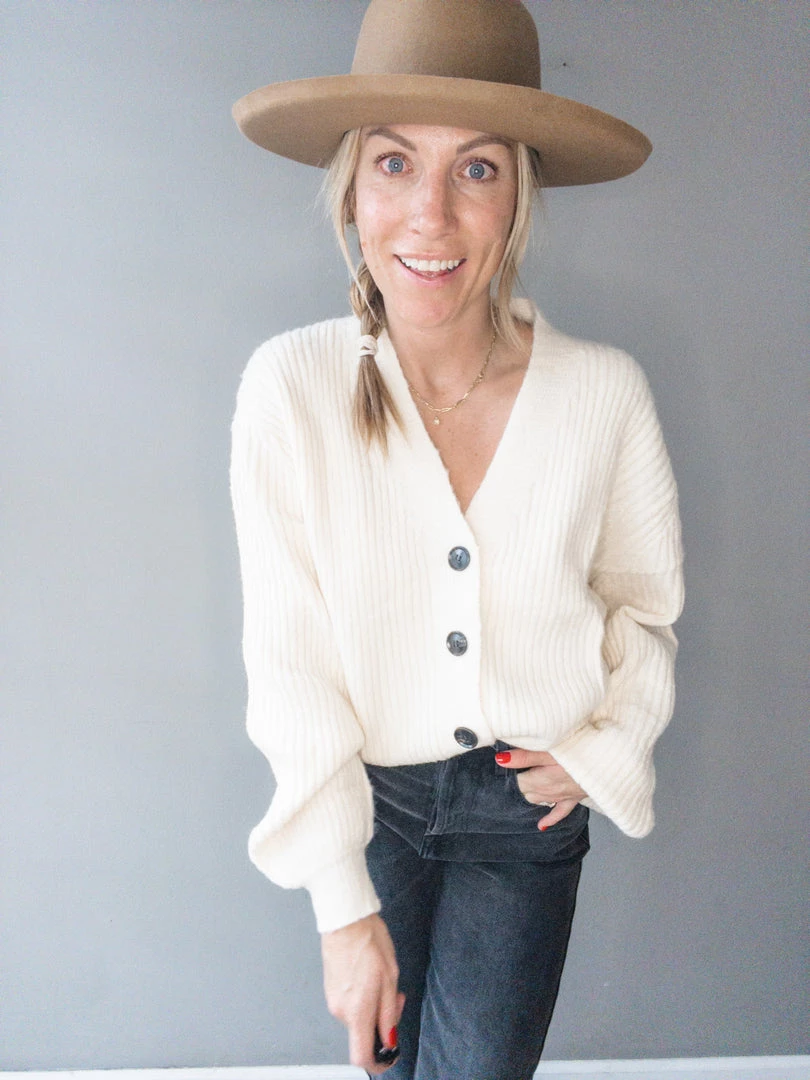 A plush ribbed cardigan with balloon sleeves and functional button front detail. Wear open over a tee or closed and paired with jeans. A super soft cozy cardigan that is light weight and functional for every wardrobe.