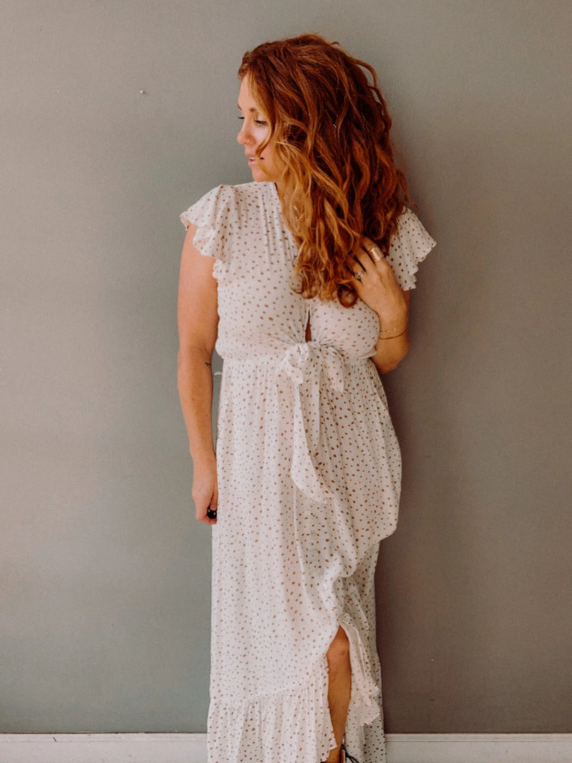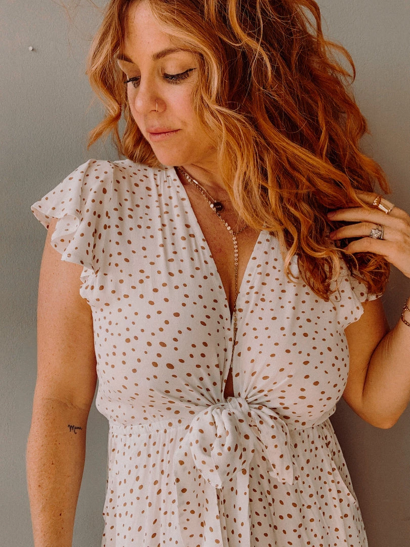 A best selling dress here at the shop!! This tie front maxi is a timeless silhouette with it’s dainty brown and white polka print and flowy, flattering body. Flutter sleeves, elasticated waist and signature tie front. With V neckline and hook clasps for optional coverage, this dress is a true showstopper you will wear time and time again! A shop fav <3