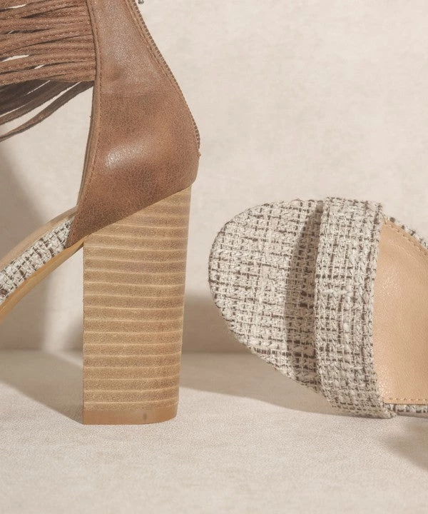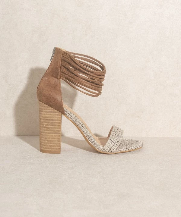 The Blair Block Heel is a great grab this holiday season!! A natural tweed toe strap with a thick layered ankle strap that gives these heels just that little extra oomph to help dress up any look. This stacked block heel has a man-made upper and insole with a leather wrap ankle and zipper closure that makes for an easy slip on style.