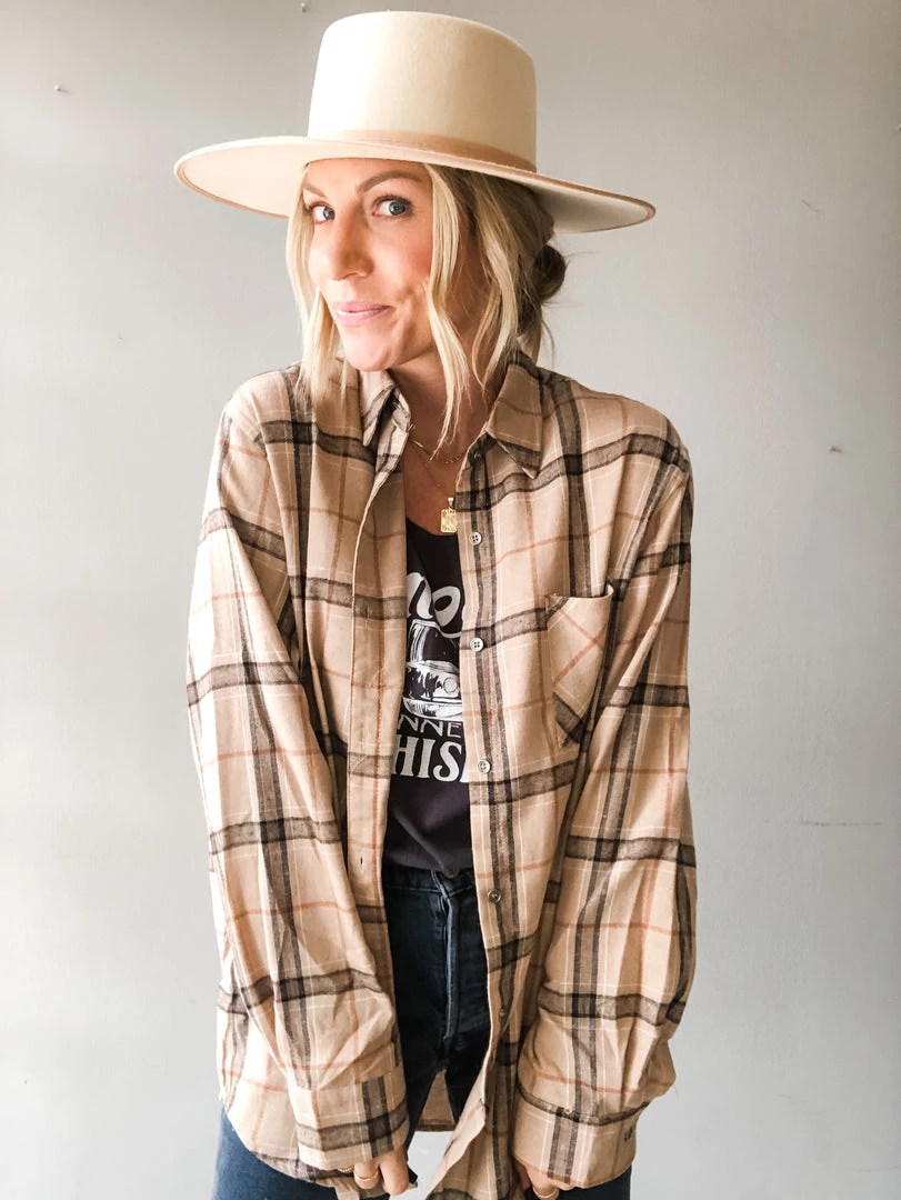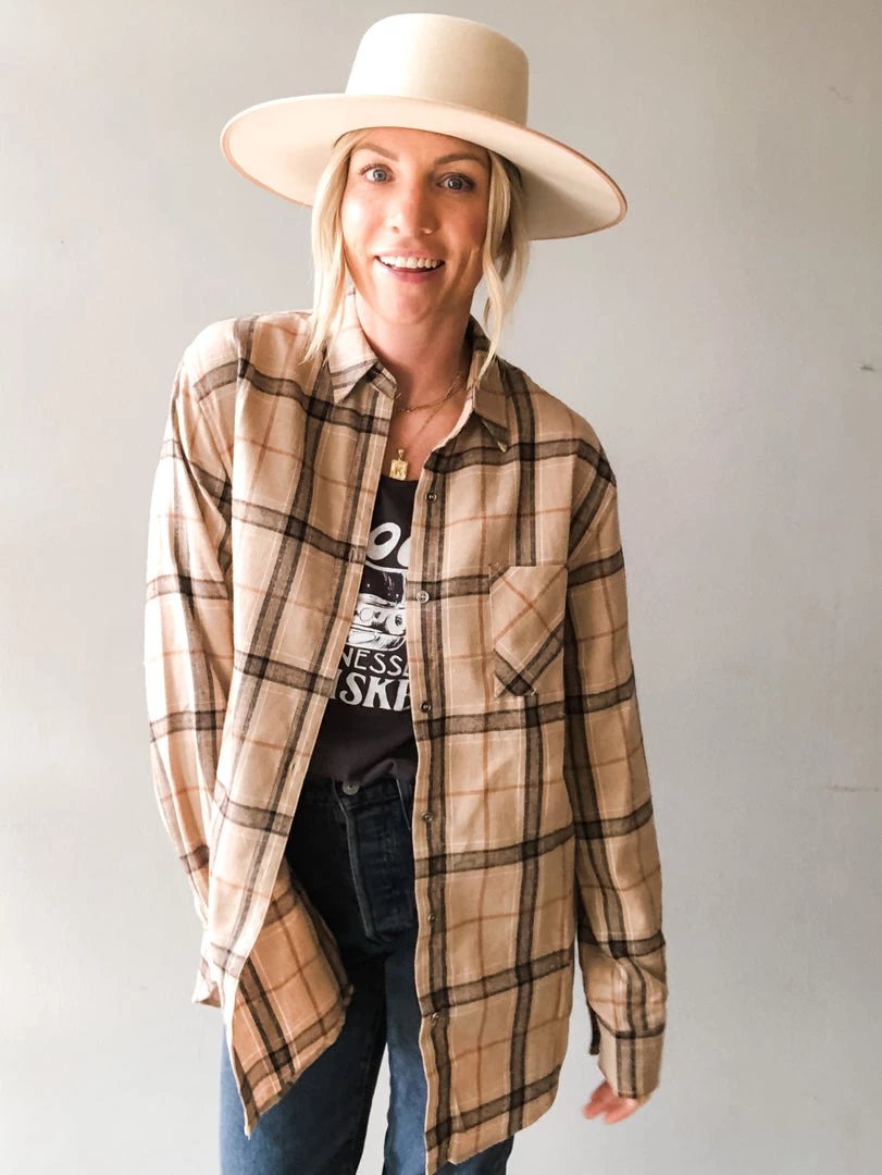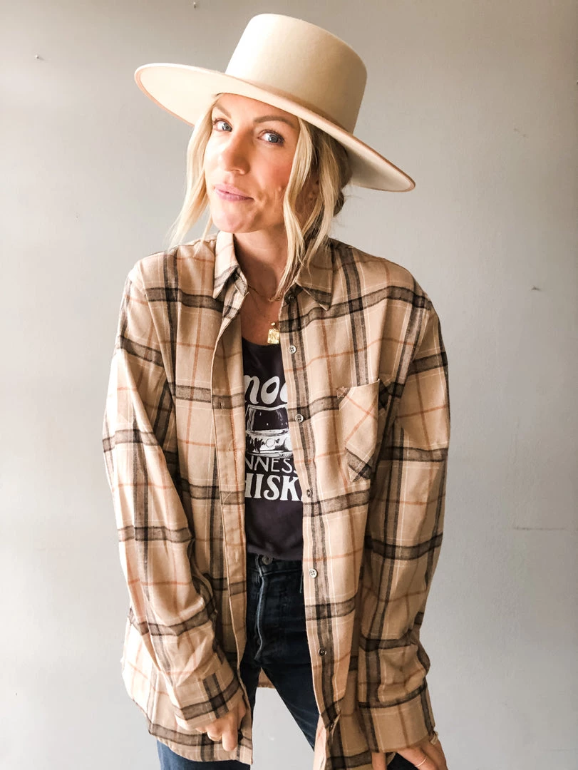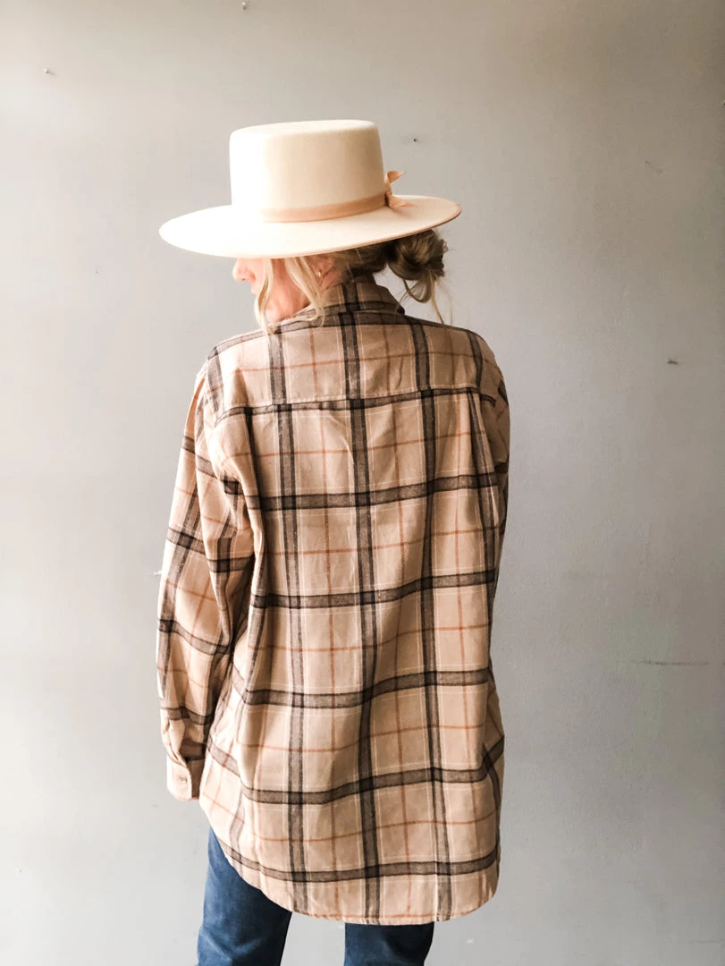 A plaid button down long sleeve with front pocket detail and button closure at the cuff. This light weight long sleeve can be layered over a graphic tee or tank for an easy everyday look as cool weather approaches. Oversized fit.