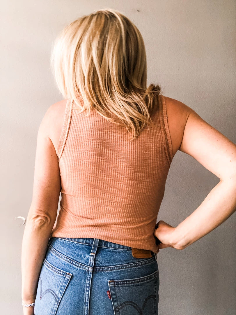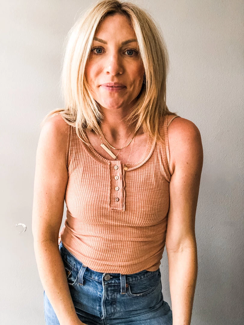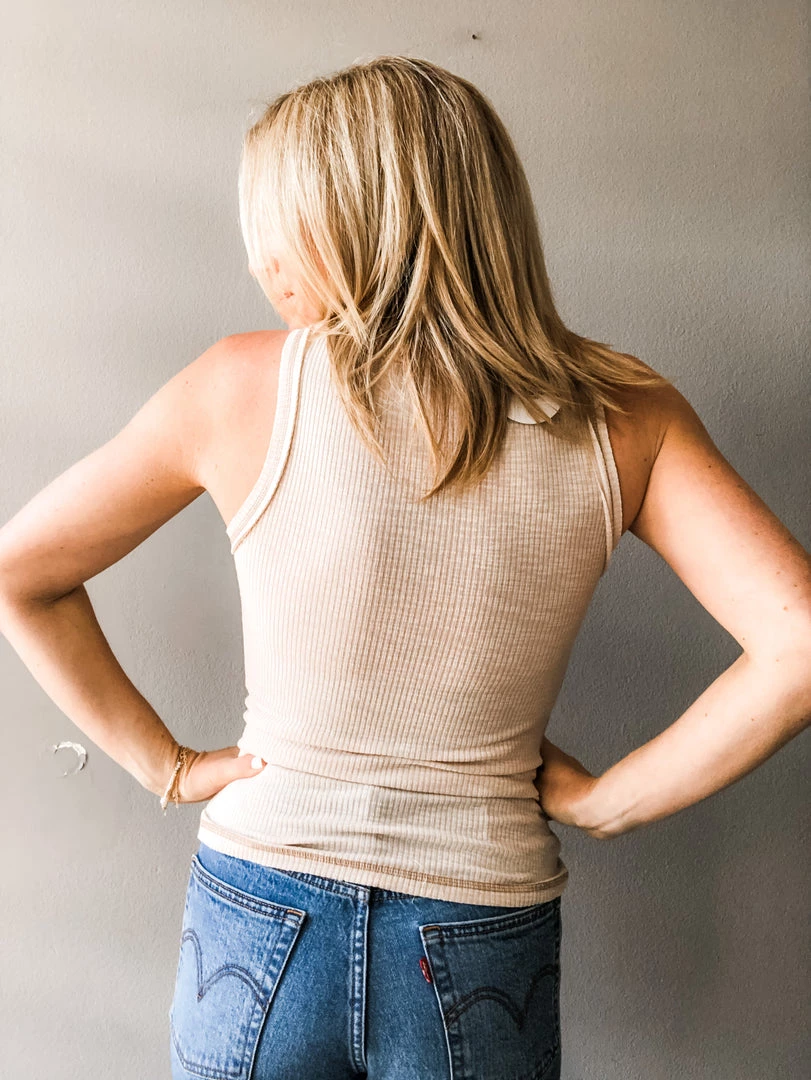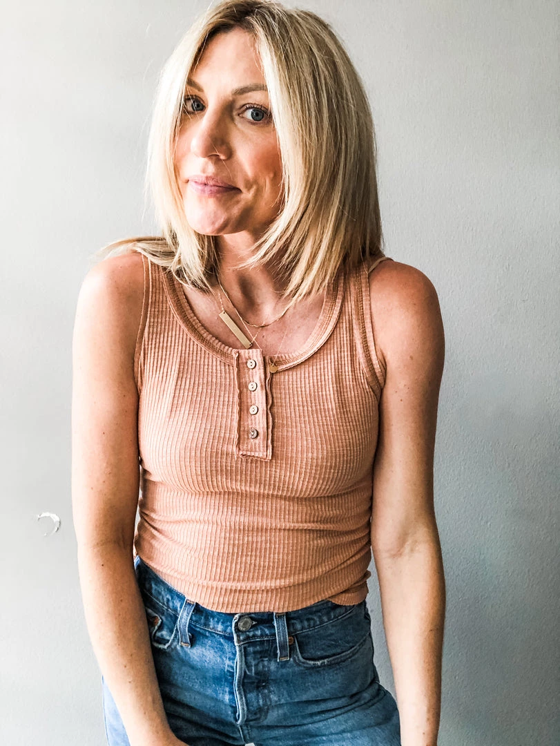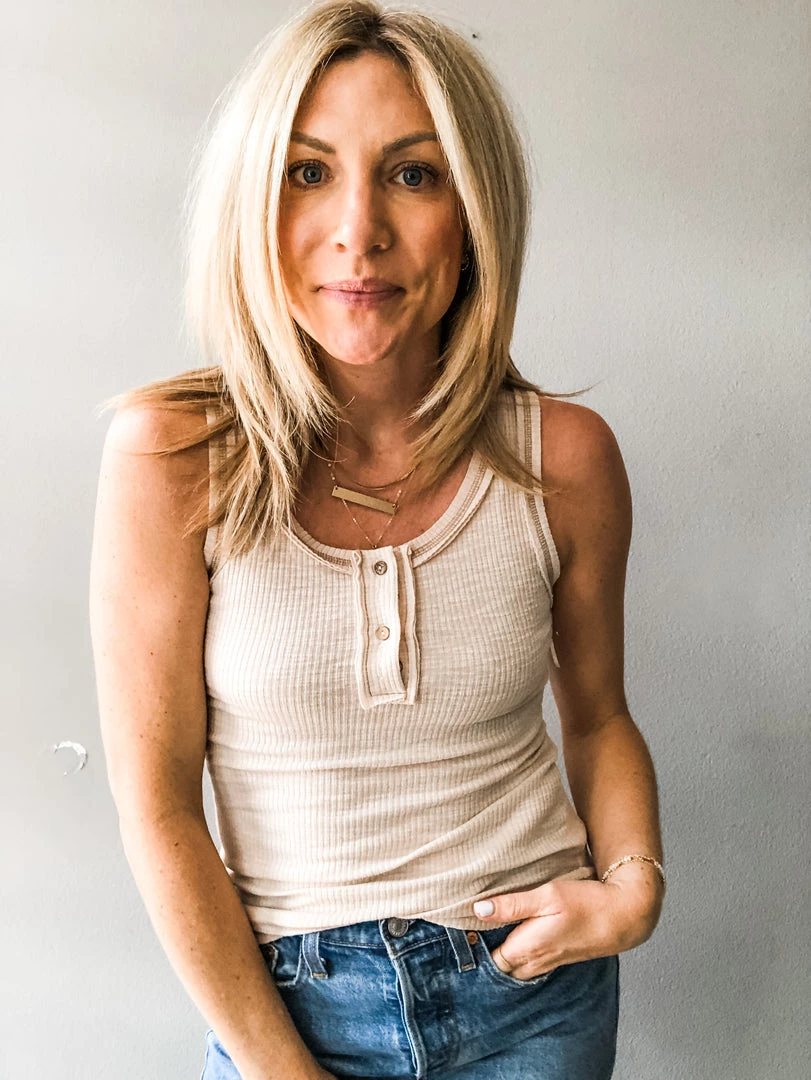 An effortless and versatile ribbed cotton henley top that we love layered or worn as is with our new Levi’s 501 short! She’s a fitted silhouette with button front closure and contrast sitiching exposed details.