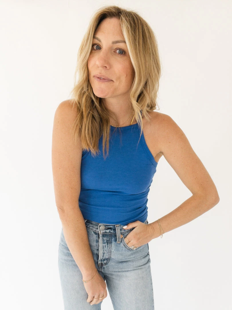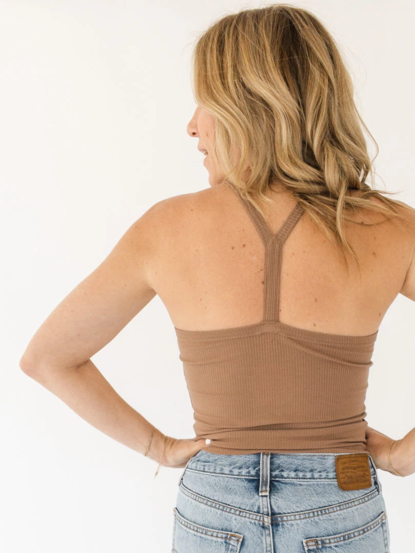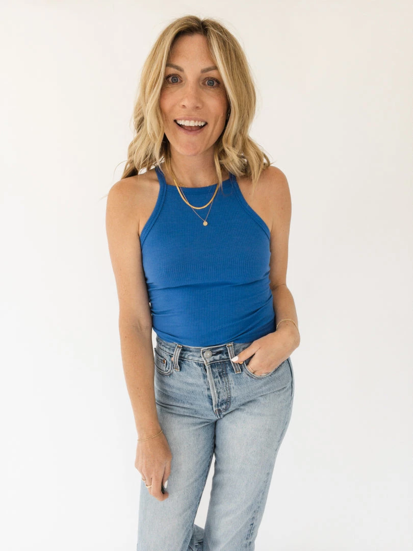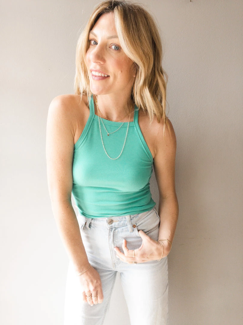The Dani Tank is a halter style tank with Y shaped back detailing that highlights your beautiful shoulders. An easy tank to layer with a shacket for those cooler Spring mornings or worn alone during those warm Summer days. This ribbed tank hits at the top of high rise bottom and is a slightly fitted.