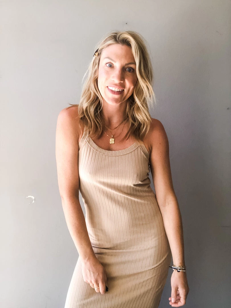 We are suckers for closet basics as good as this one!! This racerback midi dress is the perfect piece to dress up or down, wear alone or layer. A fitted ribbed knit dress with double banded trim along the arms and neck. A double slit hem adds the perfect amount of movement and just the right amount of leg.