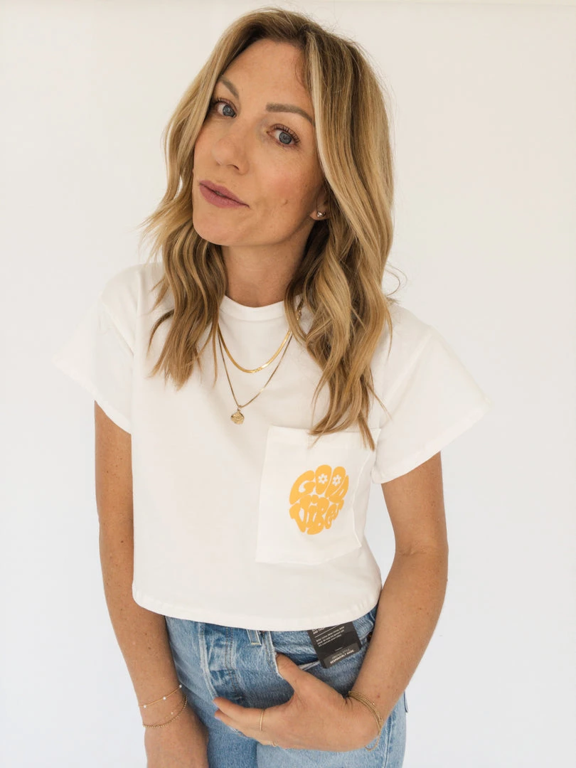 A cute cropped pocket tee with a retro Good Vibes graphic. A heavier weave tee with wide sleeves to help your body breathe in the warmer weather.